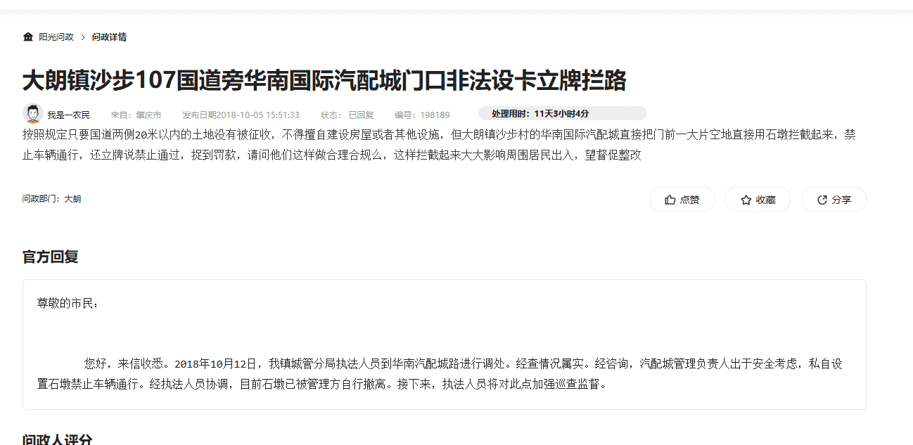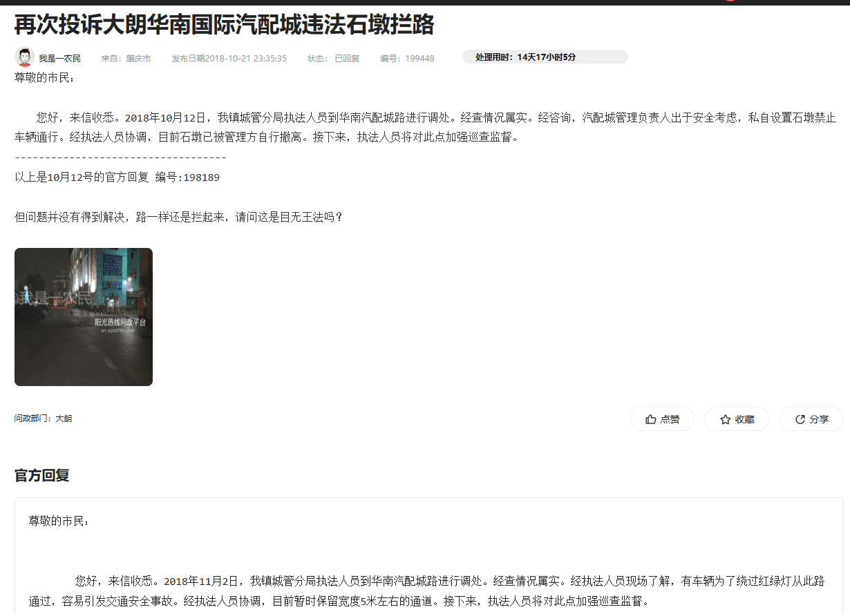 尊敬的市民,您好!您反映的问题已收悉,非常感谢您对城市管理工作的关注和监督。2026年1月7日,我分局执法人员到达现场进行调查处理。经调查,该投诉所指的道路为大朗华南汽配城正门前场地,位于省道S357线旁,非市政道路,且该石墩所在位置为村(社区)租赁时配备使用。华南汽配城为了本区域人员设施安全,在该场地左侧设置石墩、铁栏控制大型车辆进入。 根据《东莞市人民政府关于印发〈关于加强停车设施规划建设管理的实施意见〉的通知》第八点第(三十二)项的规定,市交通运输部门负责全市停车设施规划建设管理和产业化发展,我分局负责违法停车场内未经规划报建的违法建(构)筑物、建筑退让红线区内违法构筑物的执法管理。 感谢您对我们工作的理解和支持。承办单位:东莞市城市管理和综合执法局大朗分局
