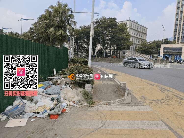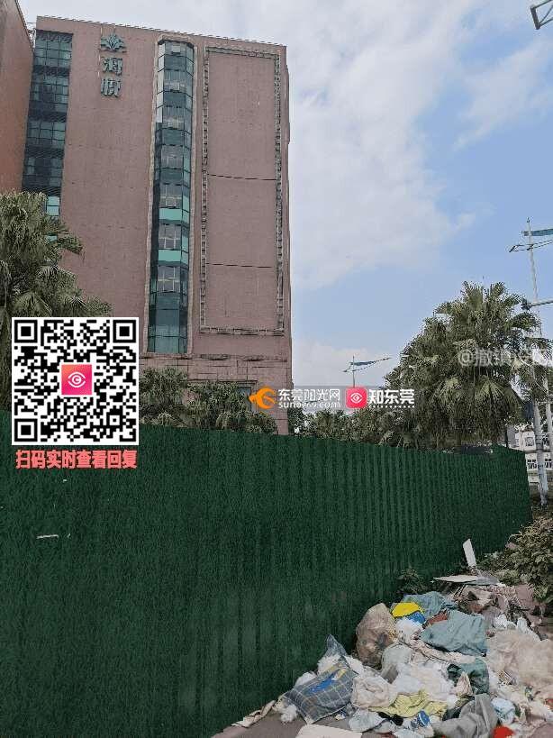 长安镇的海悦花园大酒店东北门路口处,垃圾长期堆积未处理