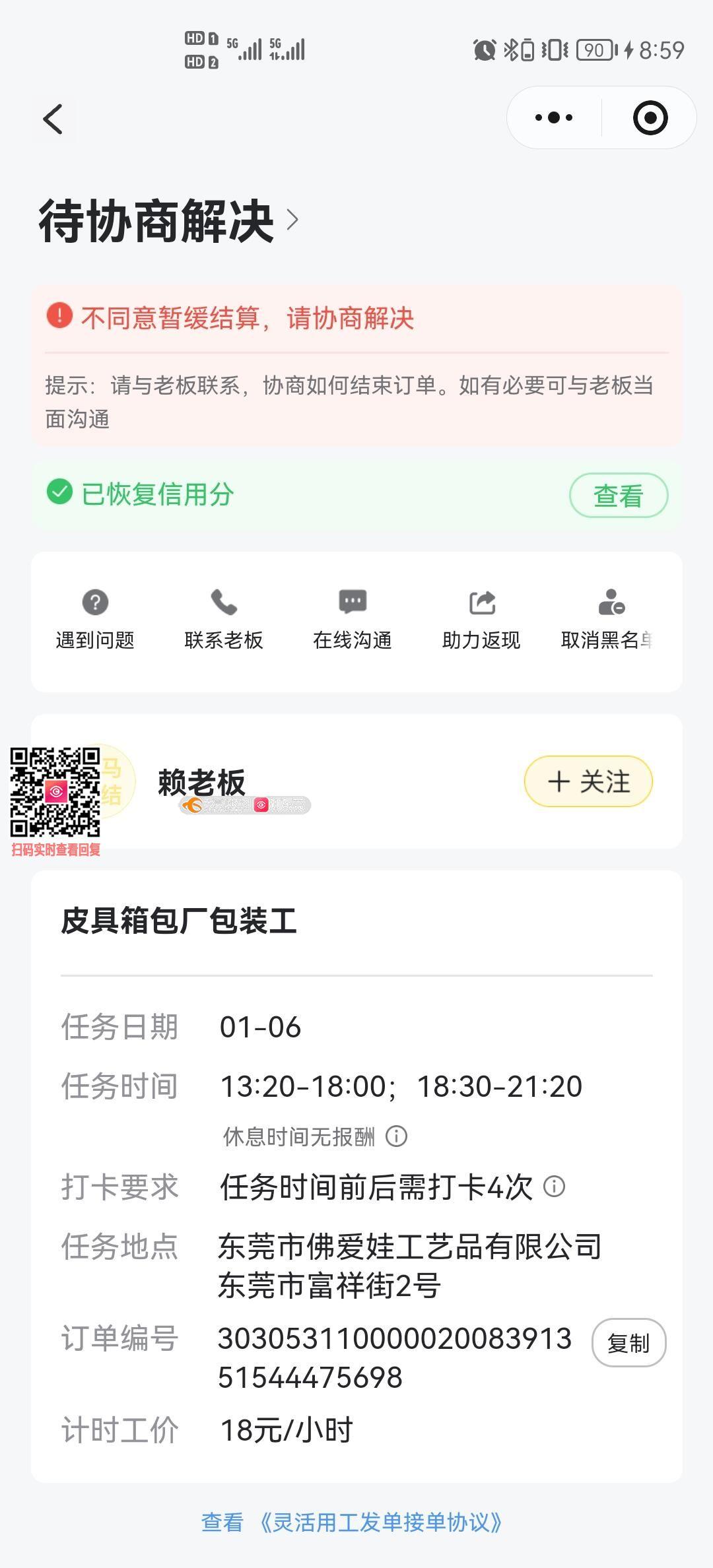 2026年1月6号上午在快马平台接到一个日结,工作内容是大包装,去了之后才发现工作内容不相符,现场油漆味很大,本人油漆过敏,不能完成工作,在小程序上打卡下班,但是老板拒绝结算工资,图片上有打卡记录,附上!