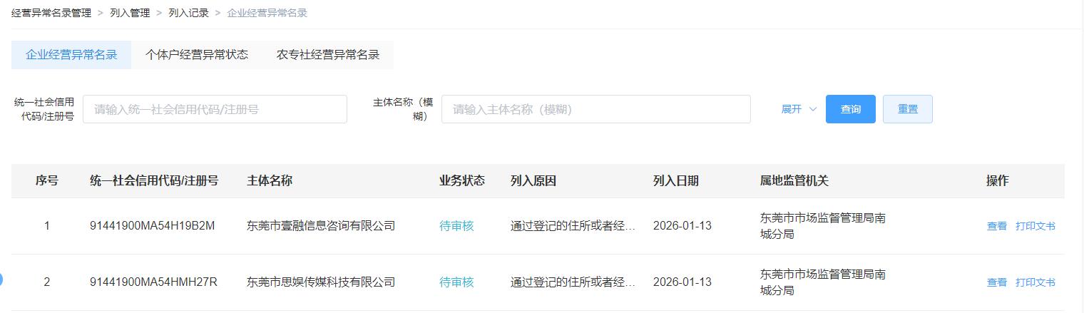 尊敬的市民,您好!您反映的问题已收悉,现回复如下:我局执法人员于2026年1月13日依法检查了东莞市南城街道莞太路南城段111号民间金融大厦1栋1012室,现场检查中未发现有东莞市思娱传媒科技有限公司、东莞市壹融信息咨询有限公司在该地址经营,由于通过登记住所(经营场所)无法联系东莞市思娱传媒科技有限公司、东莞市壹融信息咨询有限公司,我局已根据《企业经营异常名录管理办法》依法将上述企业列入经营异常名录,不予立案。如有疑问,请联系:0769-22999081,感谢您对我们工作的理解和支持!