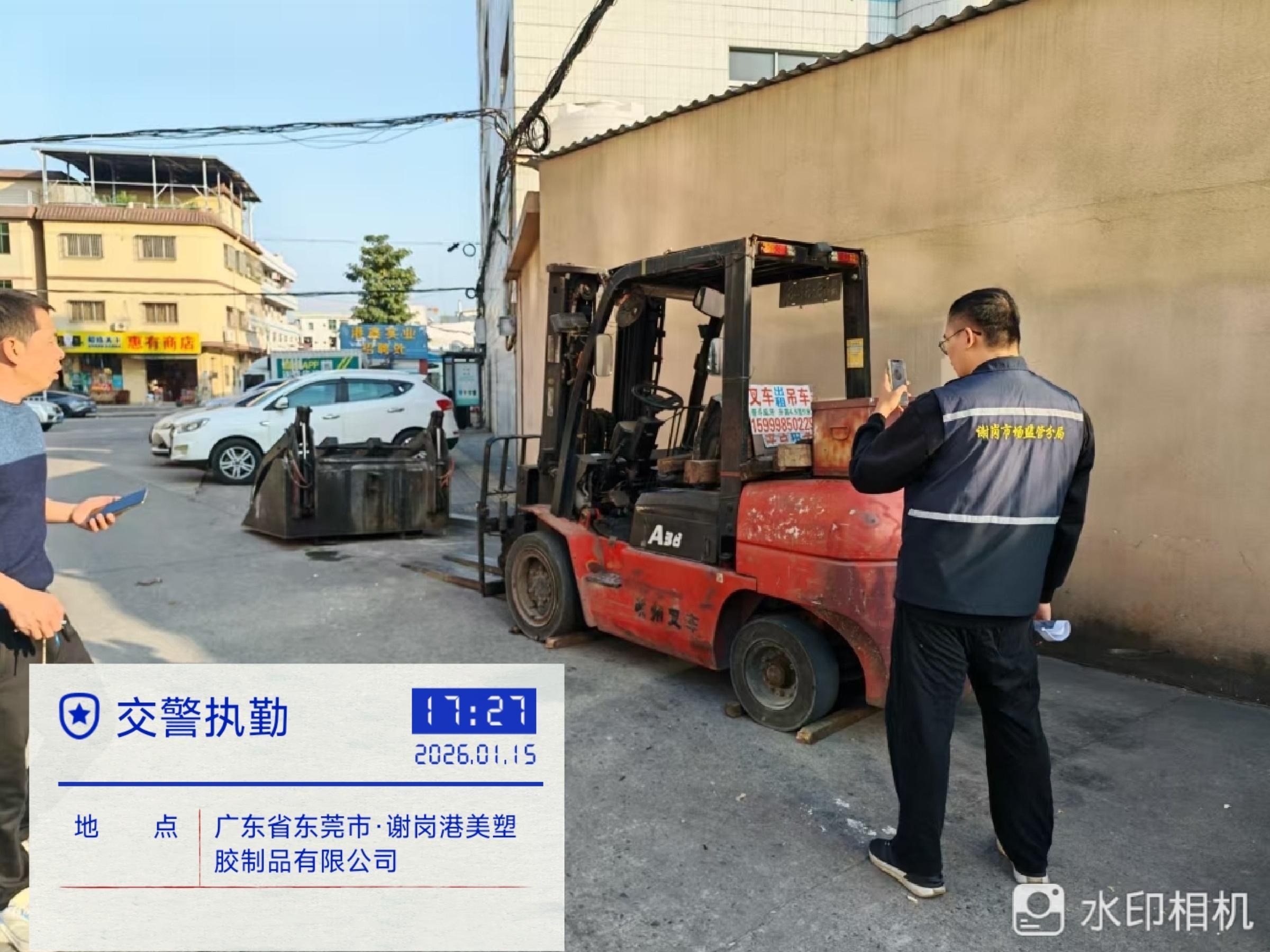 尊敬的市民,您好,收到您的反映,现回复如下: 一、现场检查情况。2026年1月14日东莞市市场监管局谢岗分局执法人员联合谢岗交警大队到东莞市港美塑胶制品有限公司(南外环路7号)门口进行检查,现场未能找到相关叉车。2026年1月15日东莞市市场监管局谢岗分局执法人员再次联合谢岗交警大队进行检查,在东莞市港美塑胶制品有限公司门口处举报人提供的位置)发现停放一台叉车,叉车上悬挂着车牌,现场通过叉车上的联系电话与叉车司机取得联系,叉车司机黄某到场后出示其《特种设备安全管理和作业人员证》(证件编号:441***********2313)。经系统查询得知上述叉车已办理使用登记,下次检验日期为2027年7月31日。 二、处理情况。东莞市市场监管局谢岗分局执法人员现场开展法律法规宣贯,让其知晓叉车投入使用前必须经检验合格且办理使用登记,叉车操作人员必须持证上岗。 感谢您对我们工作的支持和理解。