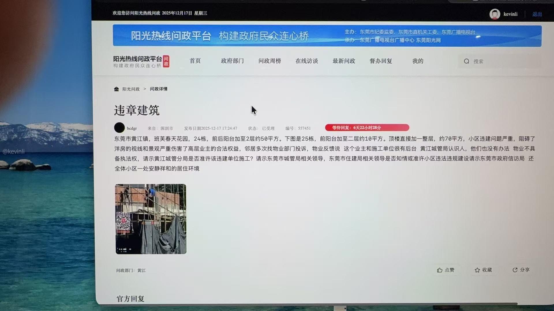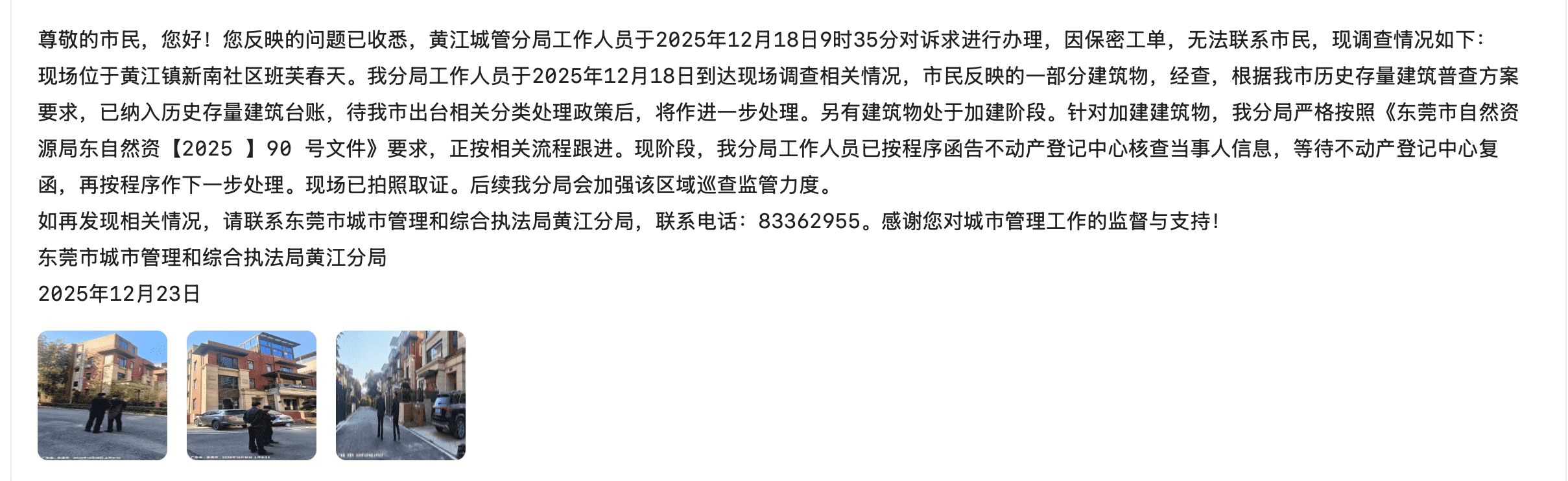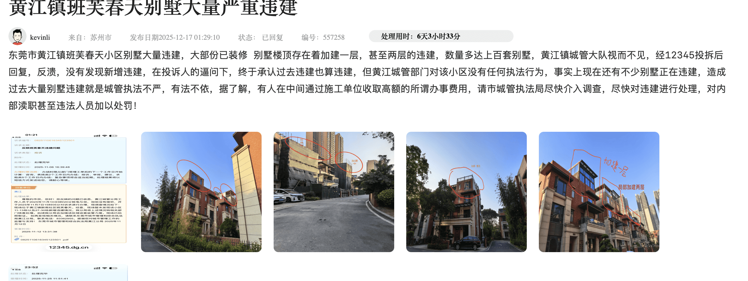 黄江班芙春天别墅大量违建到底谁在管,2026年1月8日收到12345平台正式回复,已对班芙春天正在加建的别墅进行调查取证,但对已完工的别墅加建作出待出台历吏遗留违建处理意见,请问市城管局,班芙春天别墅还有东莞各地别墅,出现大量违建是什么原因,本人包括小区业主以前也有投诉,为什么没有任何作用,导致小区的加建越来越多,这明显是存在管理漏洞和懒政行为,明显是有利益关系,将过去的违建不了了之处理。据观察,东莞城管的惯用执法套路是开违建处罚单,后续不跟进管理,这是公开的秘密和事实,某些人用这种方式谋利!2026年了,请东莞城管局回复,东莞别墅历史违建处理意见出台时间,本人将跟进进度到底, 处理不到位,本人将用自媒体公开爆光12345平 台和东莞城管局的不作为行为! 对于执法不严的城管公职人员,请一并给出处罚方案!