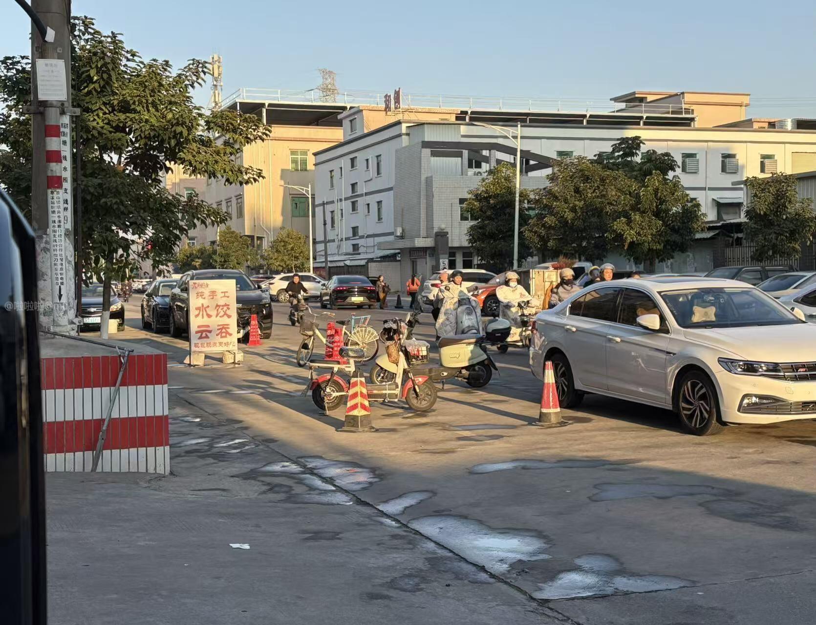 茶山镇马鞍路17号附近,店家用电动车和雪糕筒占车位,而且还占马路的位置,导致路口处交通拥堵。