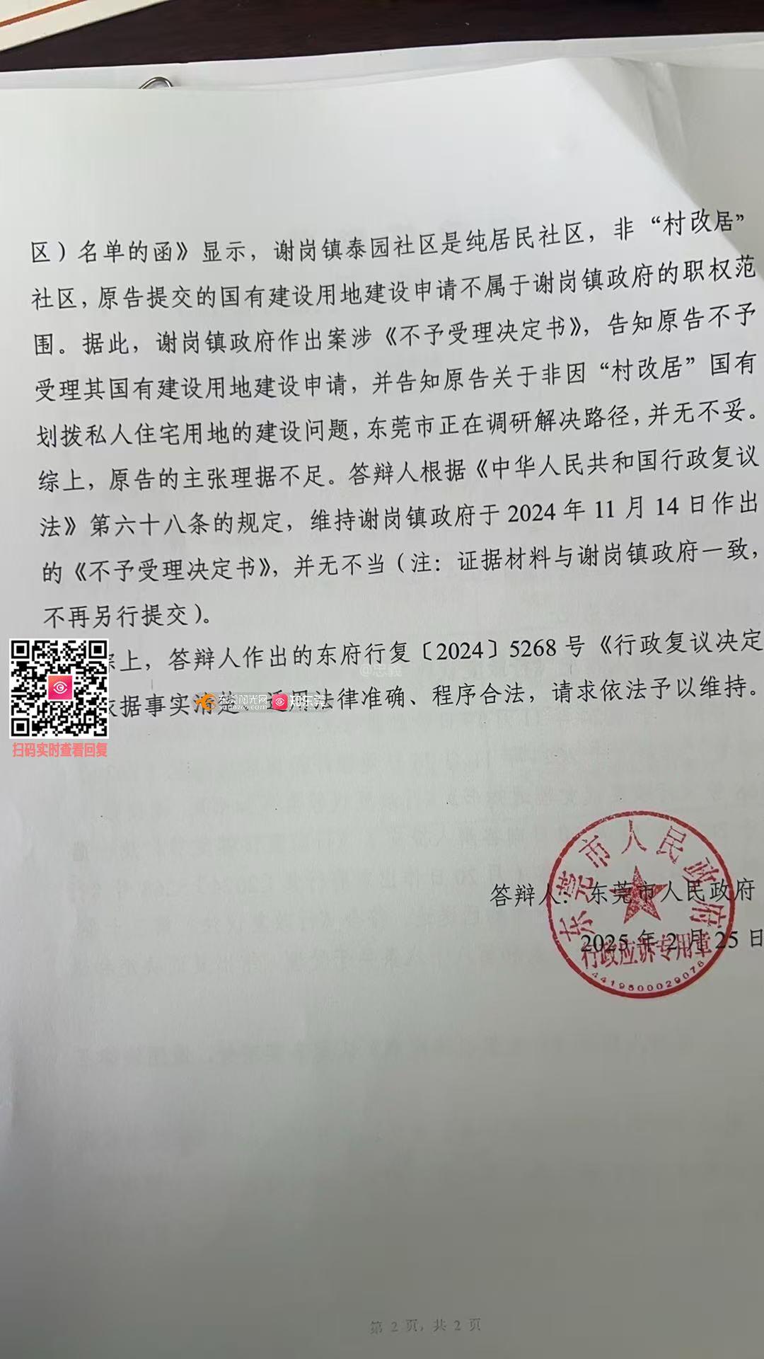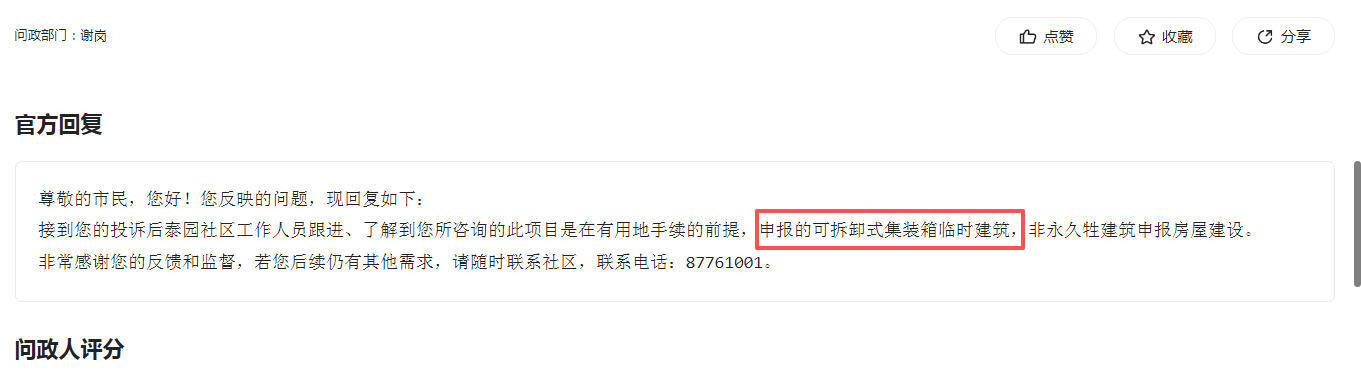 此前就谢岗镇泰园社区鸿源大厦旁在建建筑提出问政,谢岗镇答复称该项目为“在有用地手续的前提,申报的可拆卸式集装箱临时建筑,非永久性建筑”。 该答复未正面回应审批依据、职权归属、许可信息等核心问题。根据《中华人民共和国城乡规划法》第四十四条明确规定:“在城市、镇规划区内进行临时建设的,应当经城市、县人民政府城乡规划主管部门批准。”为依法厘清该临时建设的合法性,现就法律程序的核心问题再次追问,恳请贵单位依法、明确、具体地答复以下问题: 1、审批依据与职权归属: 该建筑的《临时建设工程规划许可证》具体依据哪一项或哪几项国家、省、市的政策法规或规范性文件批准?(请提供文件名称、文号)。该许可证是由哪个具体的行政单位审批并颁发的?依据《城乡规划法》,临时建设审批职权应归属“城市、县人民政府城乡规划主管部门”,请明确谢岗镇范围内此项职权的具体行使单位。 2、许可使用期限: 根据法律规定,临时建筑有明确的批准使用期限。该“可拆卸式集装箱临时建筑”获得的《临时建设工程规划许可证》批准的使用期限是多久?自何年何月何日起至何年何月何日止?该期限是否已在施工现场或法定平台进行公开? 前次问政答复未能满足公众对依法行政与政务公开的合理期待。临时建设的合法性不仅在于“有手续”,更在于其审批、许可、期限等全流程的公开透明,并严格符合《城乡规划法》等上位法规定。请贵单位针对以上两点,逐项给予具有法律与政策依据的明确答复,并提供可查验的许可信息。