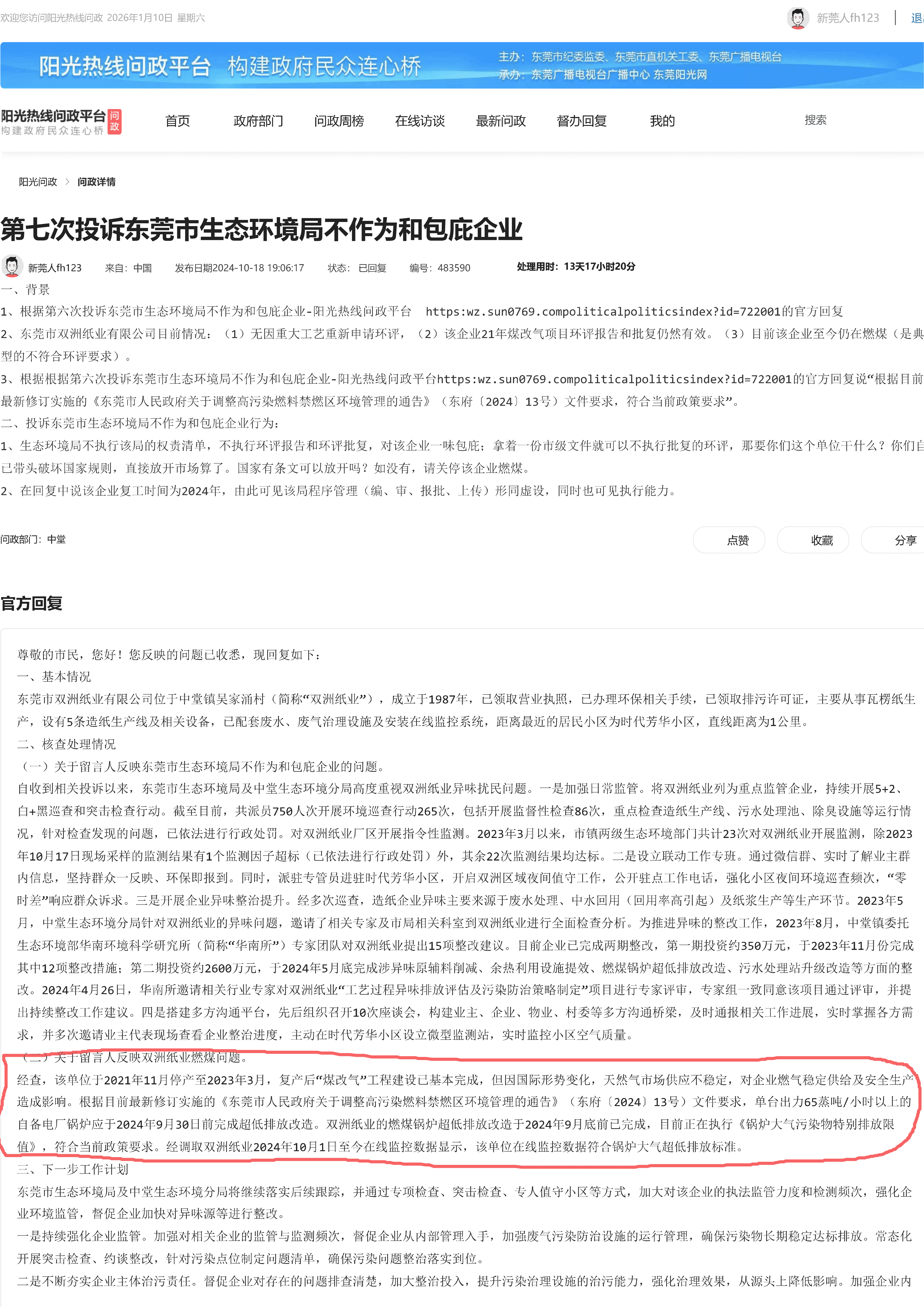 一、背景 根据阳光热线问政平台编号为483590的问政内容“第七次投诉东莞市生态环境局不作为和包庇企业”。 东莞市生态环境局官方回复:(二)关于留言人反映双洲纸业燃煤问题。 经查,该单位于2021年11月停产至2023年3月,复产后“煤改气”工程建设已基本完成,但因国际形势变化,天然气市场供应不稳定,对企业燃气稳定供给及安全生产造成影响。根据目前最新修订实施的《东莞市人民政府关于调整高污染燃料禁燃区环境管理的通告》(东府〔2024〕13号)文件要求,单台出力65蒸吨小时以上的自备电厂锅炉应于2024年9月30日前完成超低排放改造。双洲纸业的燃煤锅炉超低排放改造于2024年9月底前已完成,目前正在执行《锅炉大气污染物特别排放限值》,符合当前政策要求。 二、问题 1、东莞市生态环境局官方回复依据东府〔2024〕13号文件要求,称可以燃煤,而环境影响报告表的批复(东环建〔2021〕1474号)是“煤改气”。暂且不论这文件当时是否符合要求,单论在2021年至2024年东府〔2024〕13号文件发布之前这段时间,企业一直在燃煤,为什么包庇他们?有什么不可分割的利益关系? 东府〔2024〕13号文件哪一条能体现可以代替该企业的环评报告和环评批复?根据《中华人民共和国环境影响评价法》(2018年修订)、《建设项目环境保护管理条例》(2017年修改)、《中华人民共和国环境保护法》(2014年修订)、《广东省环境保护条例》(2019年修订)关于建设项目声环境影响评价文件的要求,(东环建〔2021〕1474号)批复“煤改气”是依法批复的环评文件,东莞市生态环境局竟以一份市级文件对抗依据国家及省级法律法规批复的环评?知道什么是上位法吗?是什么利益关系让主管生态环境的部门拿着鸡毛当令箭去包庇企业?