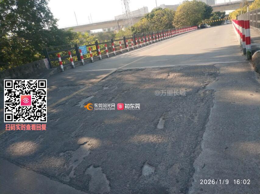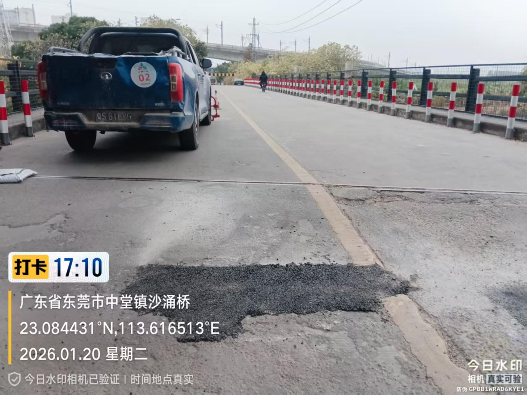 位置:中堂镇槎滘朱沙路砂涌中桥两侧 描述:2025年11月问政该路破损,严重影响车辆正常通行,回复反馈11月9日完成修复。但2026年1月,市民路过发现路面保持原状,无任何修复痕迹。 诉求:该路段虽不是主要路段,但每日通车量还是很多,破损路面带来很大安全隐患,请有关部门认真研讨,尽快修复,谢谢!