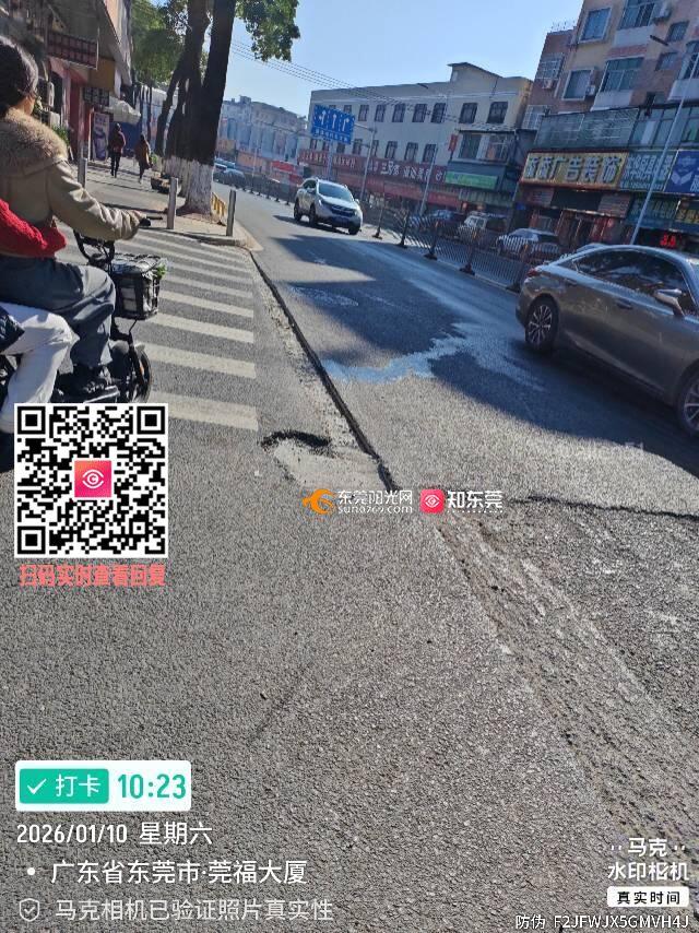 莞温路天天超市门口道路挖坑后不修复,严重危害市民出行安全风险