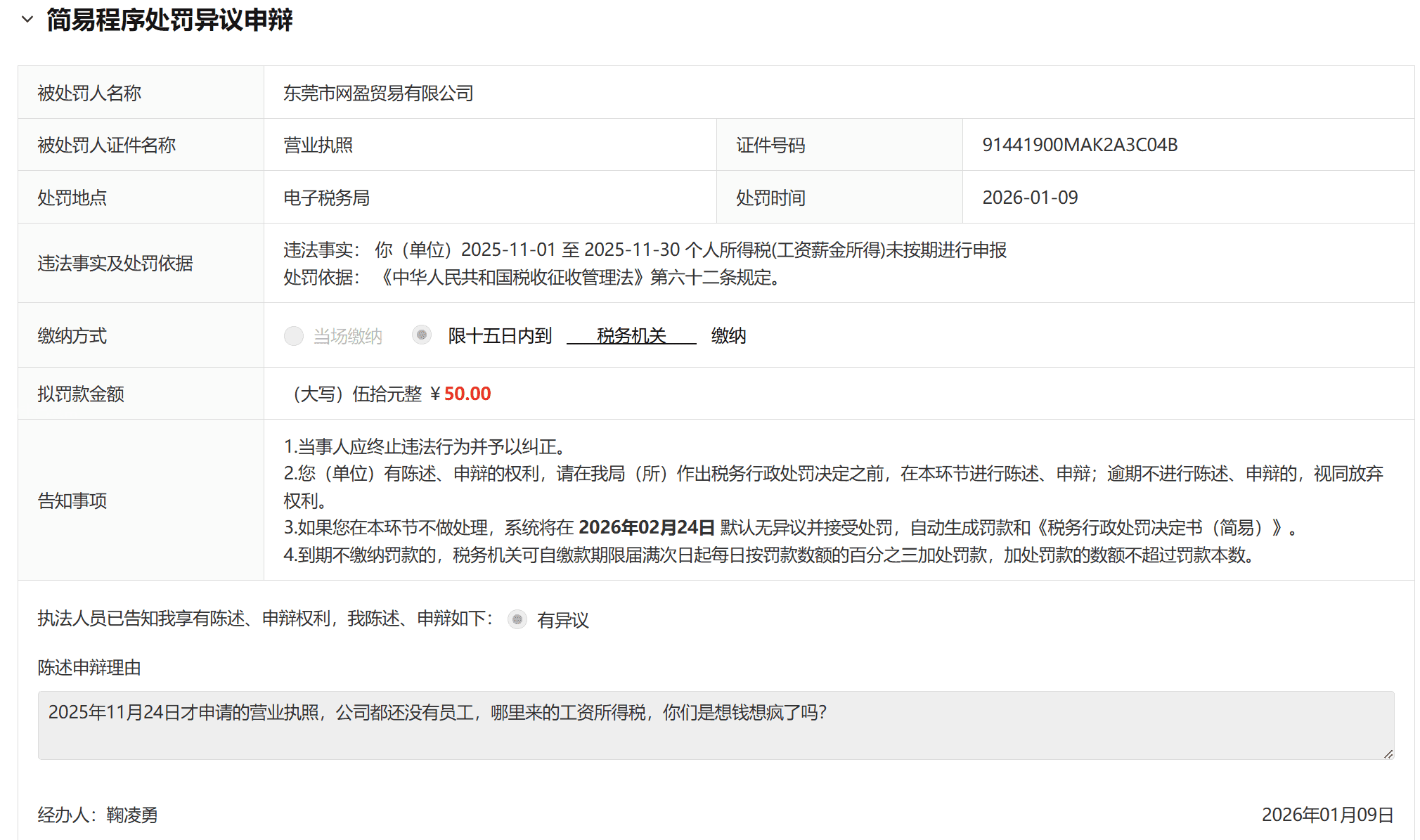 昨天收到了 违法事实: 你(单位)2025-11-01 至 2025-11-30 个人所得税(工资薪金所得)未按期进行申报 的行政处罚。公司名:东莞市网盈贸易有限公司 2025年11月24日申请的营业执照; 11月26日进行税务登记; 12月2日申请公司基本户; 12月16日找账务公司开始代记账报税; 12月18日注册电商平台开始干活。 处罚不合理的理由: 11月公司未正式运营; 11月公司没有员工; 11月从办理营业执照的时间算起只剩下5天; 连员工都没有如何去报个人所得税? 对于新公司即将到期未办理的政务事项是否应该发个短信提醒下?即使在电子税局的待办事项里提醒下也好。 就这样直接下处罚单是不是处罚的太着急了点?吃相这么难看的吗?