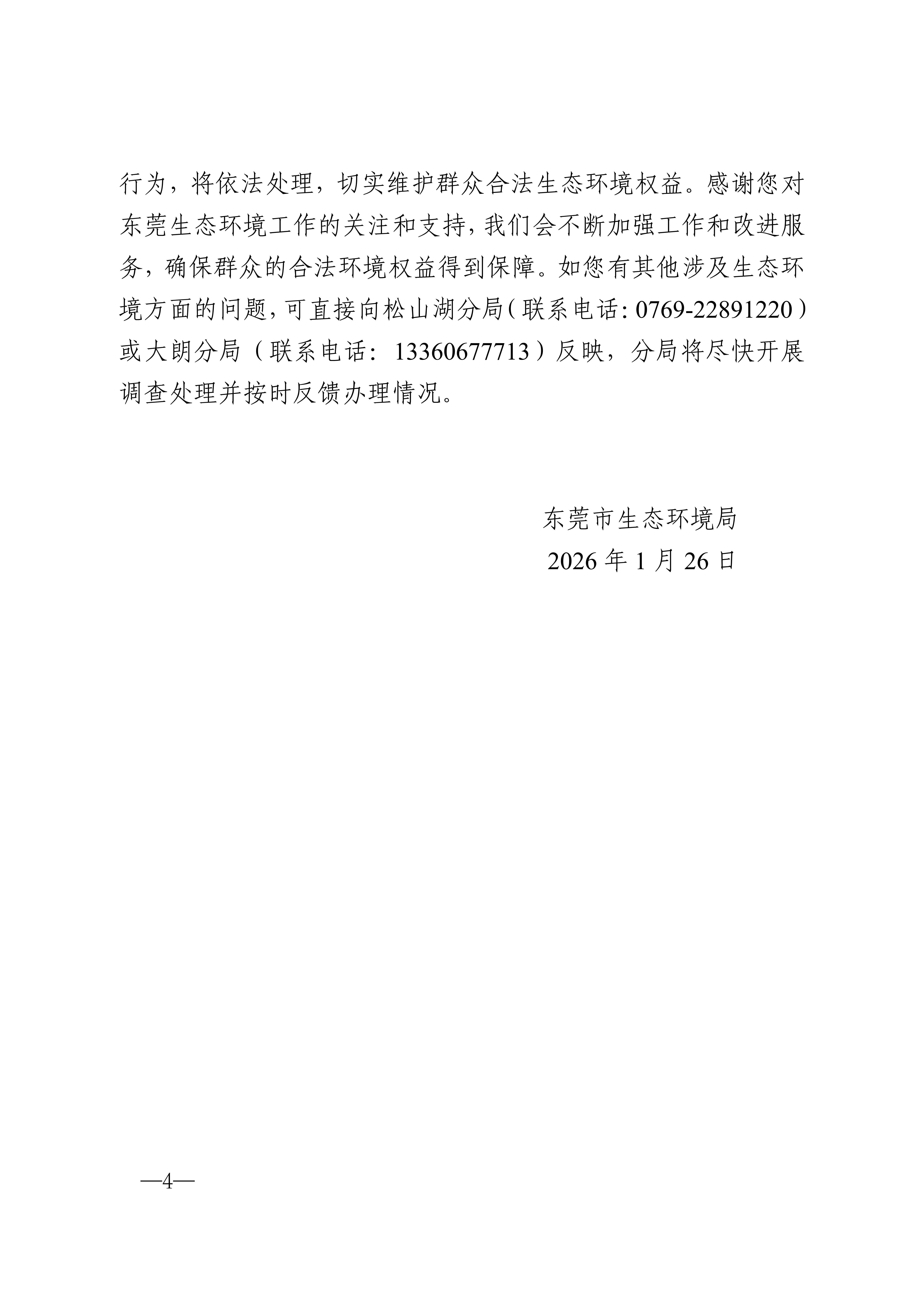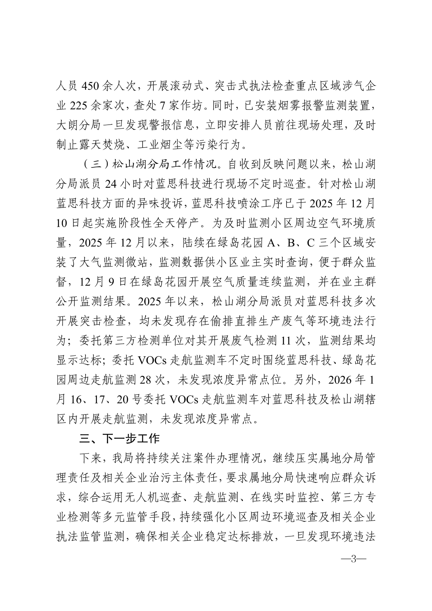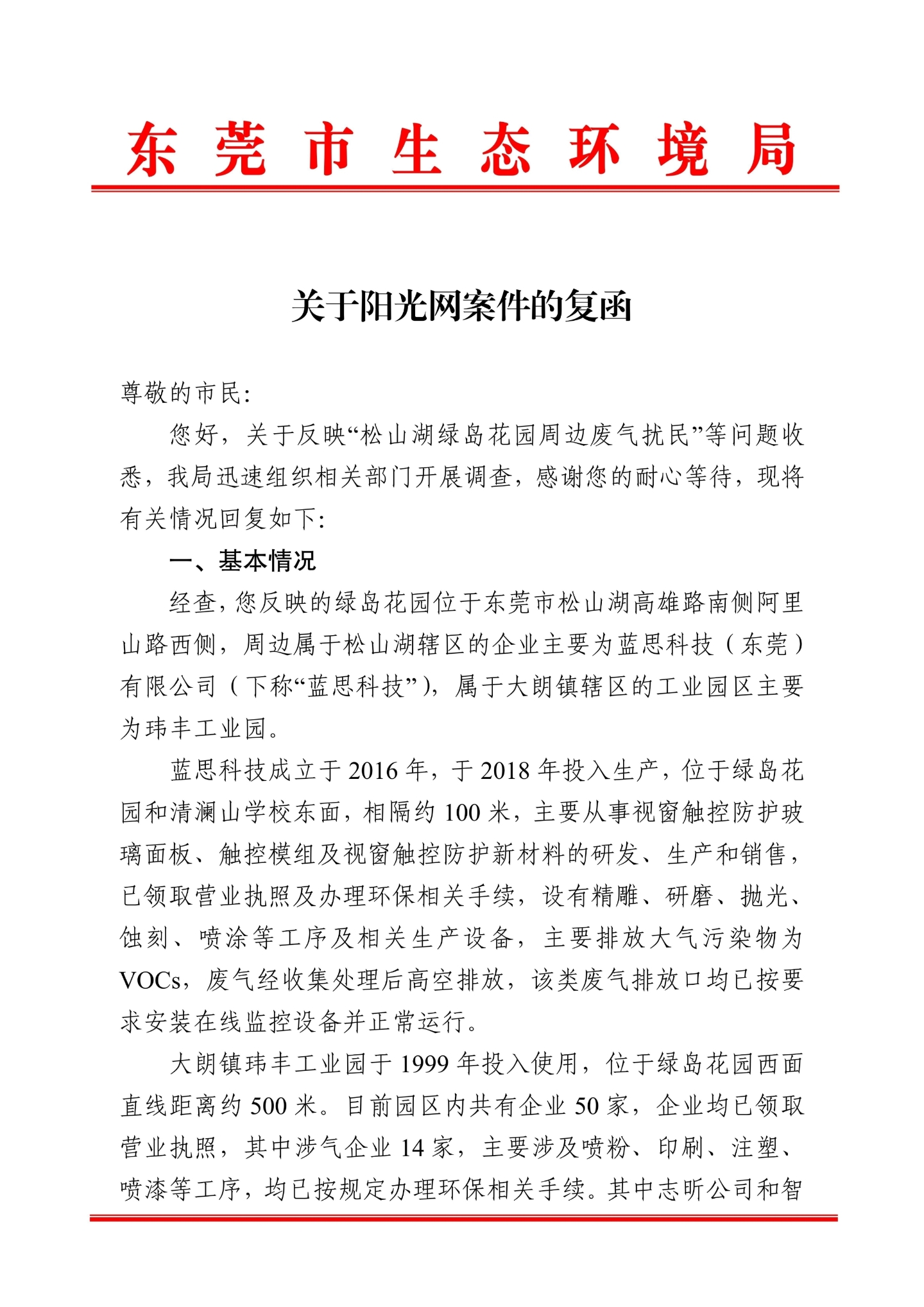尊敬的市民: 您好,关于反映“松山湖绿岛花园周边废气扰民”等问题收悉,我局迅速组织相关部门开展调查,感谢您的耐心等待,现将有关情况回复如下: 一、基本情况 经查,您反映的绿岛花园位于东莞市松山湖高雄路南侧阿里山路西侧,周边属于松山湖辖区的企业主要为蓝思科技(东莞)有限公司(下称“蓝思科技”),属于大朗镇辖区的工业园区主要为玮丰工业园。 蓝思科技成立于2016年,于2018年投入生产,位于绿岛花园和清澜山学校东面,相隔约100米,主要从事视窗触控防护玻璃面板、触控模组及视窗触控防护新材料的研发、生产和销售,已领取营业执照及办理环保相关手续,设有精雕、研磨、抛光、蚀刻、喷涂等工序及相关生产设备,主要排放大气污染物为VOCs,废气经收集处理后高空排放,该类废气排放口均已按要求安装在线监控设备并正常运行。 大朗镇玮丰工业园于1999年投入使用,位于绿岛花园西面直线距离约500米。目前园区内共有企业50家,企业均已领取营业执照,其中涉气企业14家,主要涉及喷粉、印刷、注塑、喷漆等工序,均已按规定办理环保相关手续。其中志昕公司和智宝龙公司2家主要涉气企业近期已搬迁。 二、调查处理情况 自收到群众反映废气问题以来,我局高度关注,迅速组织相关执法科室会同东莞市生态环境局松山湖分局(下称“松山湖分局”)和东莞市生态环境局大朗分局(下称“大朗分局”)积极回应业主诉求,持续加强对绿岛花园周边环境巡查力度。完整答复请查看附件。承办单位:东莞市生态环境局