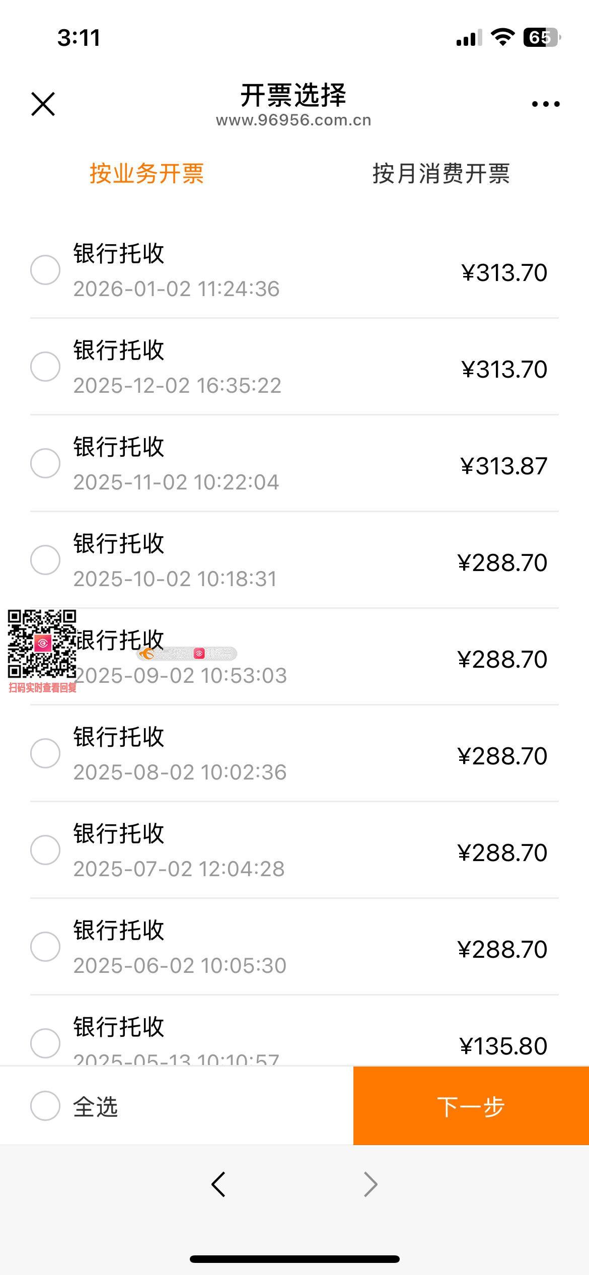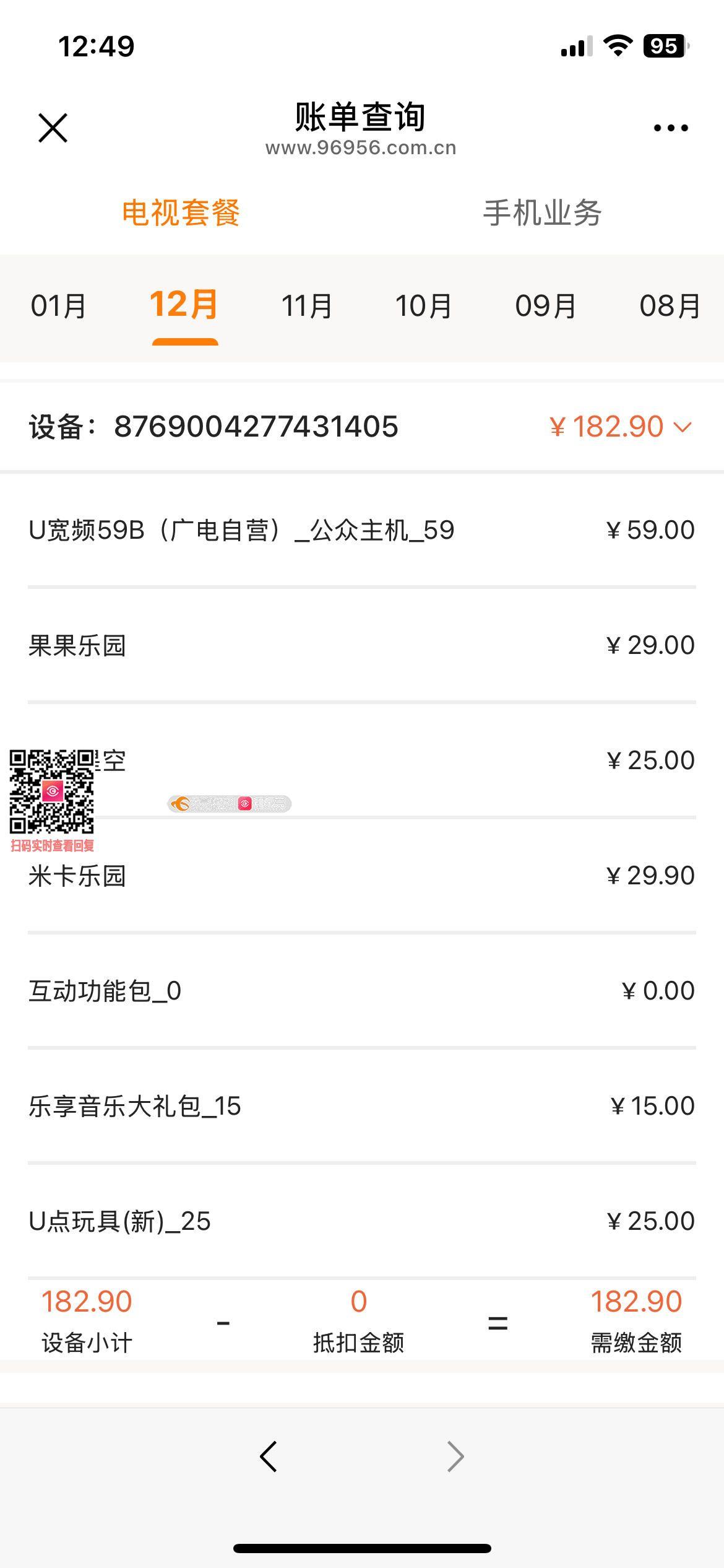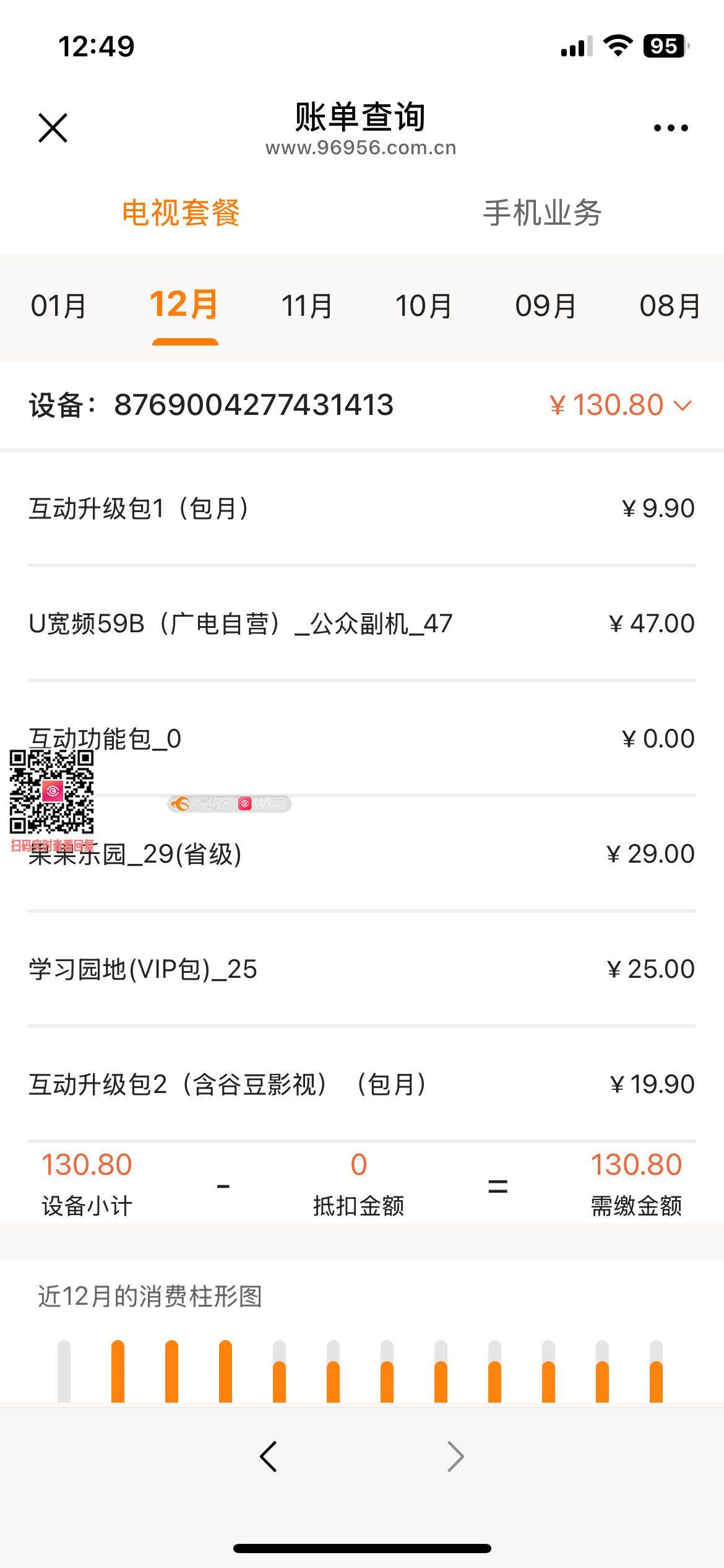 2. 收费信息不透明,未尽告知义务:每月扣费短信仅笼统显示“广电服务费”总额,未详细列明增值业务名称、收费标准等明细,导致我长期未能发现违规扣费情况。直至登录官方公众号时,看到近一年的帐单每月高达313.7元,才得知存在多项未订购的收费业务,并且公众号也只能查询到近一年的帐单,致电96956方知已从2018年开始持续至今还在自动续费方式收费。