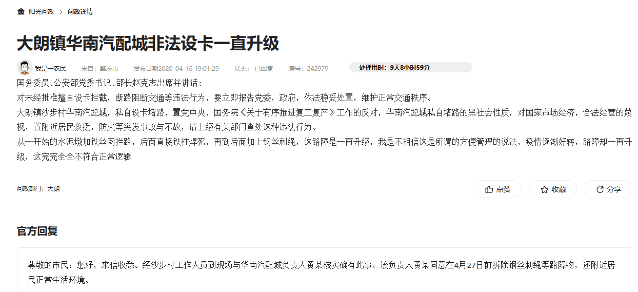 根据《公路安全保护条例》第十一条的规定,公路建筑控制区的范围从公路用地外缘起向外的距离标准为:省道不少于15米。这意味着,在省道两侧各15米的范围内,是不允许非法私自占用,华南国际汽配城老板,非法叫保安设卡拦路,阻碍周边老百姓的正常日常通行,请相关部门给予处罚,已经投诉多次,城管执法部门来了,他就搬开,执法部门一走他又重新封堵起来,上一个投诉,官方回复说汽配城是为了防止大型车辆进入,但是他现在封堵起来连小型车辆都无法进出,这完全是自相矛盾的说法,如果这事情不归城管管,请你帮我转接相关负责的部门,不然我要问政镇长,究竟是归谁管,是谁在包庇汽配城。