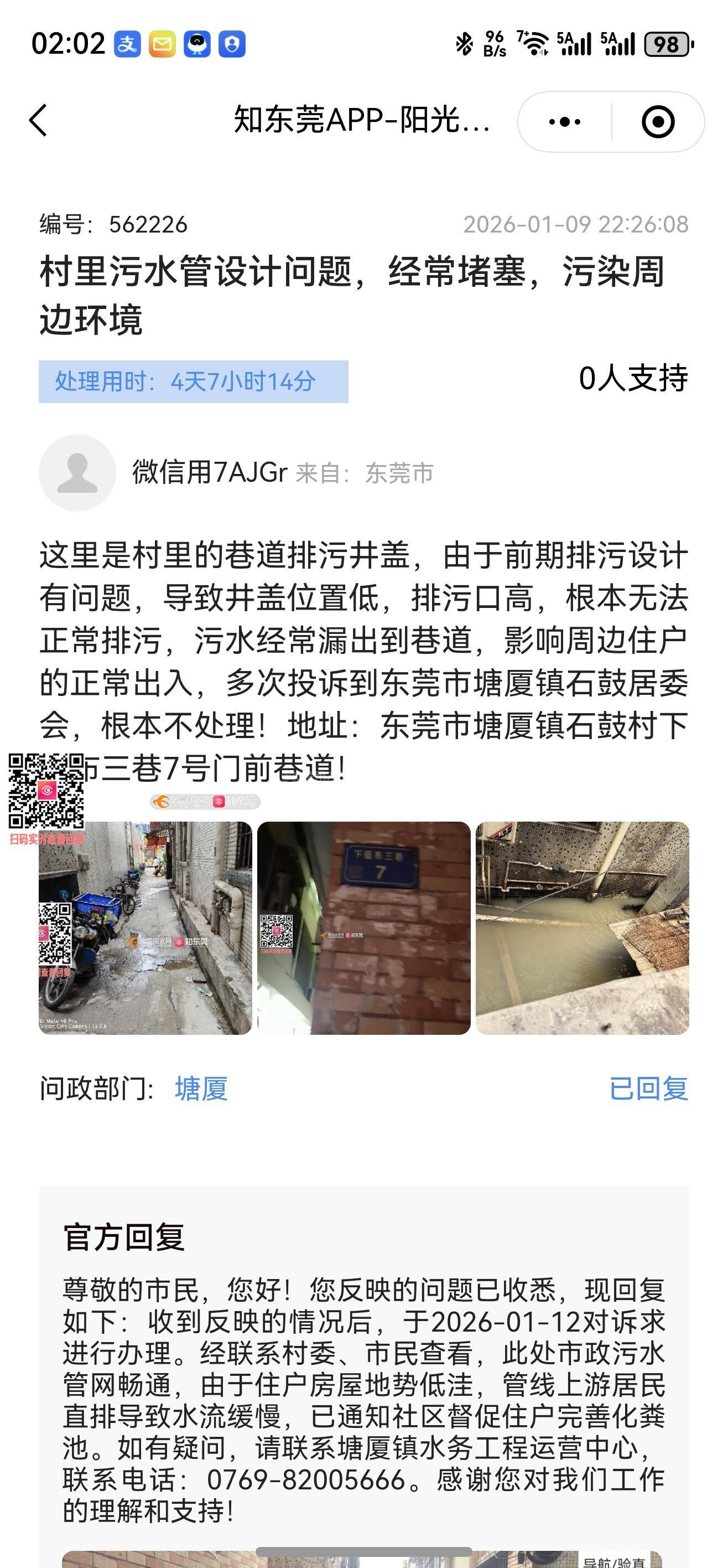 东莞市塘厦镇石鼓下低布三巷7号排污管道堵塞不解决