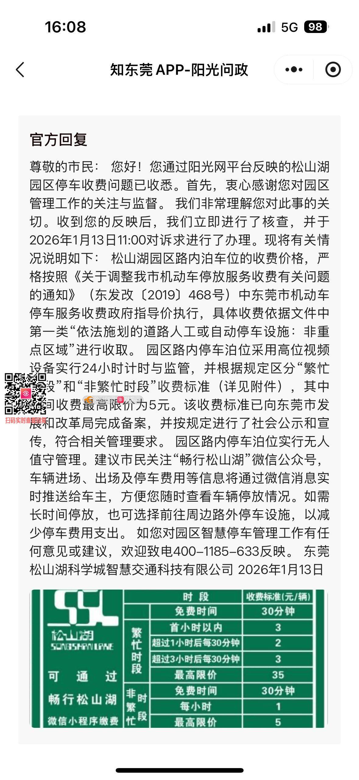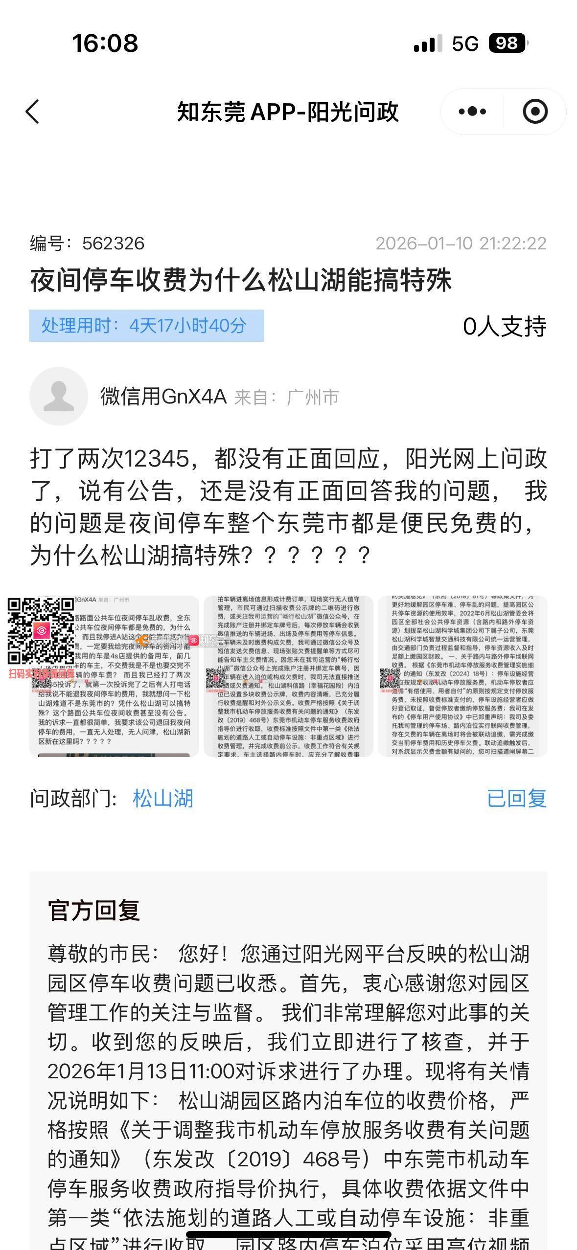 我打了两次12345后又连续问了几次阳光网,现在松山湖你回应我说经过政府备案,可以24小时收费,且夜间收费最高限价5元,那我的夜间收费订单可不止5元一单喔,起码都是8元起步的???那怎么说???而且我想问松山湖为什么就你们特殊24小时收费呢???其他镇区市区都没免费夜间停车的路段,而且实施不是近一两年的事了,为什么松山湖没有???既然在东莞有地方能实施免费夜间停车的路段,那我请问松山湖不能向优秀惠民的措施学习吗?????