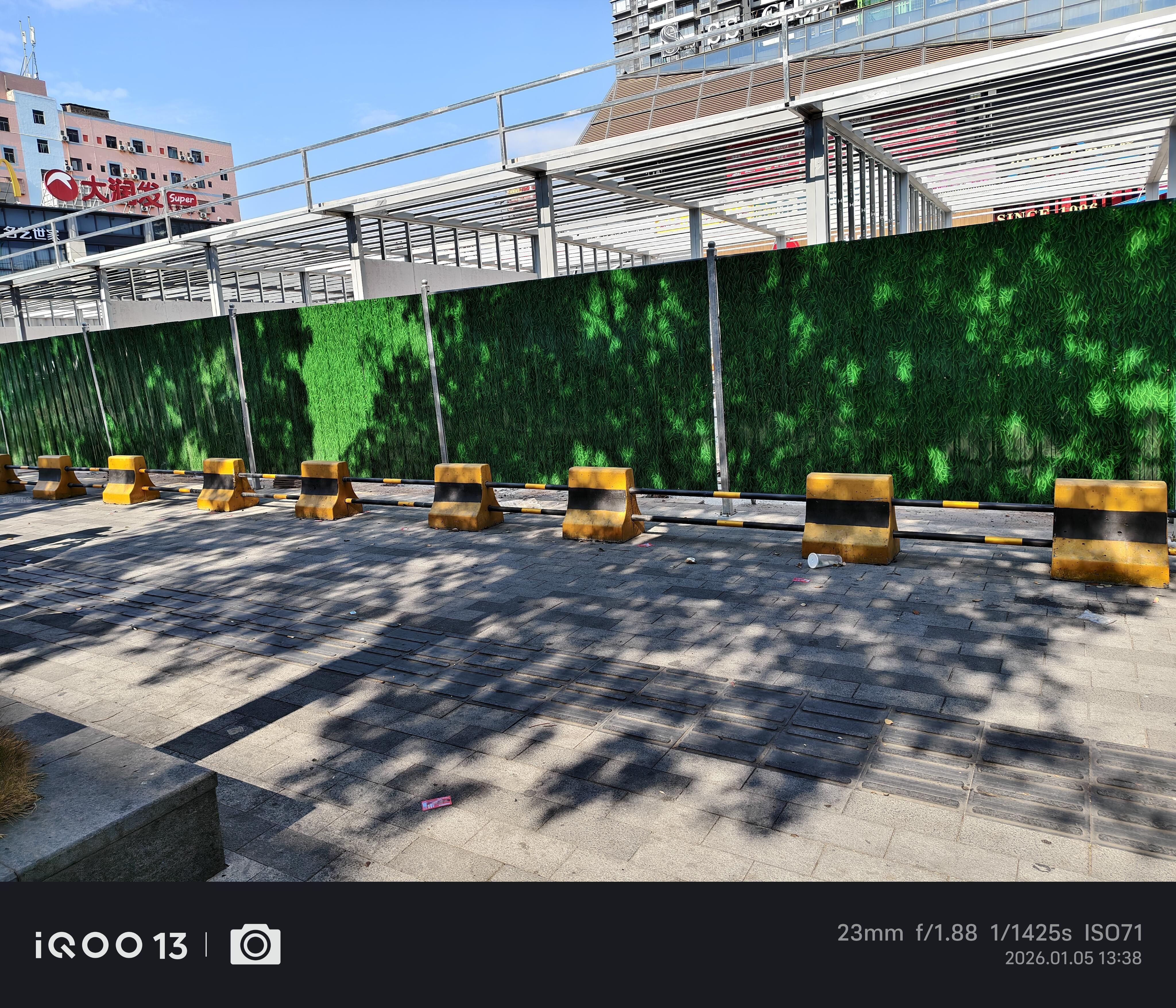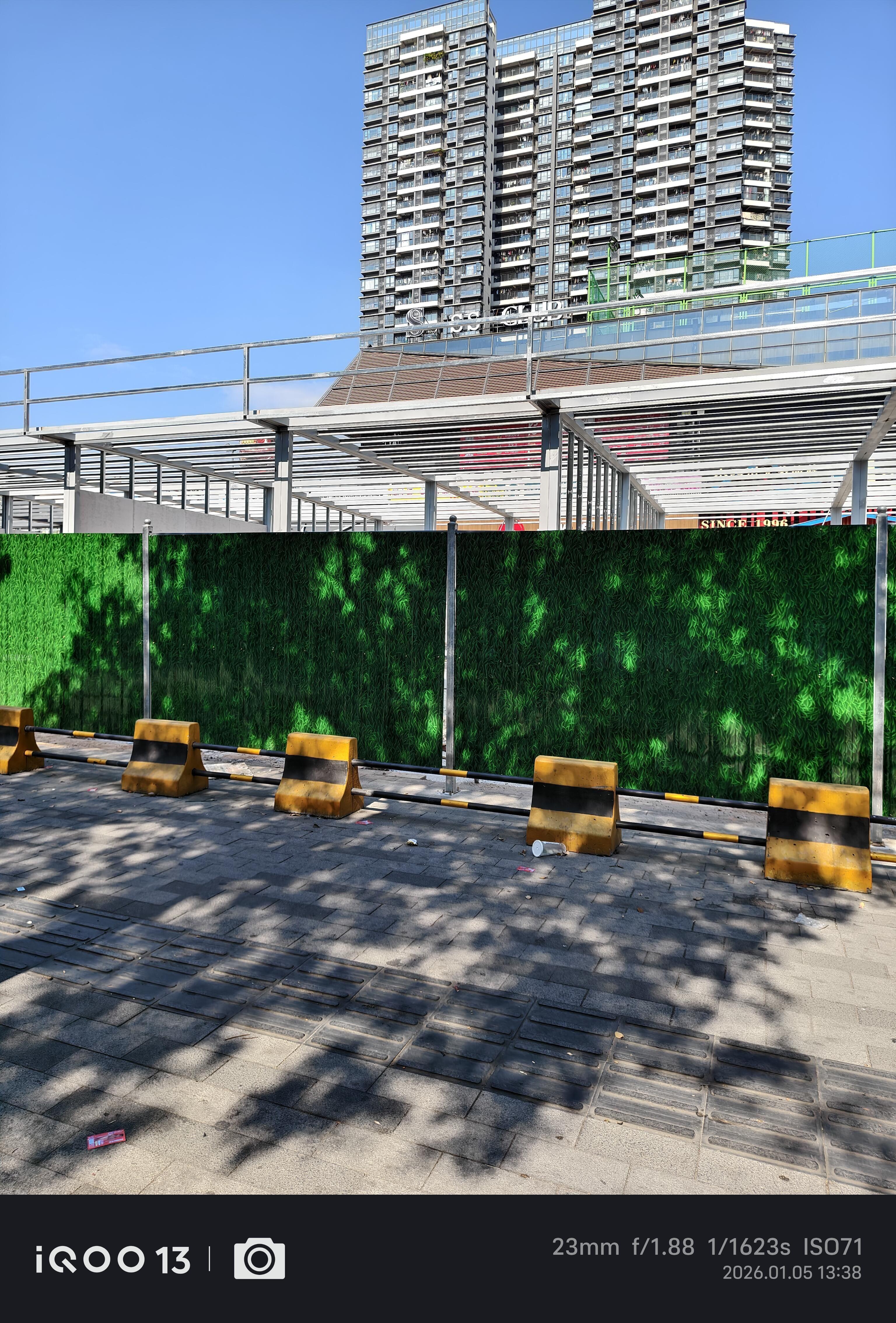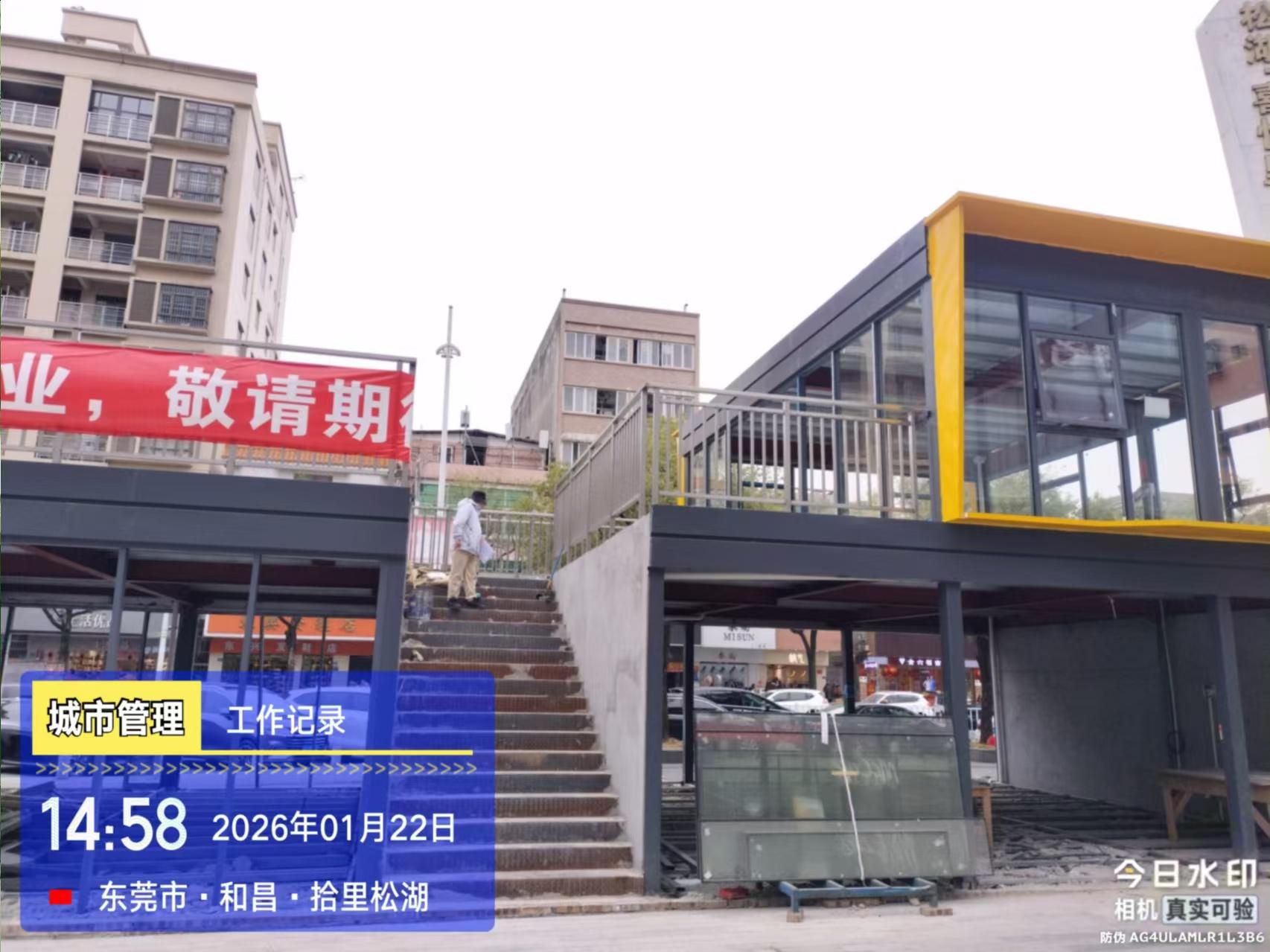 违建位置位于东莞市东坑镇东兴中路和昌拾里松湖商业街区(备案名为新悦广场)。现场可见商铺前违规搭建钢结构框架建筑(含玻璃幕墙、金属框架围挡等),同时存在违规设置硬质隔离桩、占用公共人行道搭建临时构筑物的情况,部分搭建物无明显规划审批标识,已超出商铺合法经营用地范围,侵占了公共空间。责令相关责任方限期拆除违法搭建的构筑物、隔离设施等,恢复公共空间原貌
