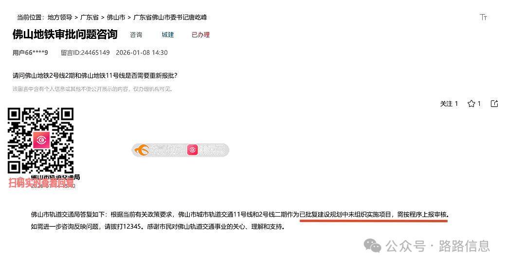2026年1月14日,佛山市轨道交通局在人民网领导留言板上回复了市民关于佛山地铁2号线二期和佛山地铁11号线是否需要重新报批的询问,为持续数月的传闻画上了句号。该局在答复中明确表示:根据当前有关政策要求,佛山市城市轨道交通11号线和2号线二期作为已批复建设规划中未组织实施项目,需按程序上报审核。 3号线是否面临着与佛山地铁同样子的问题,需要重新报批呢?