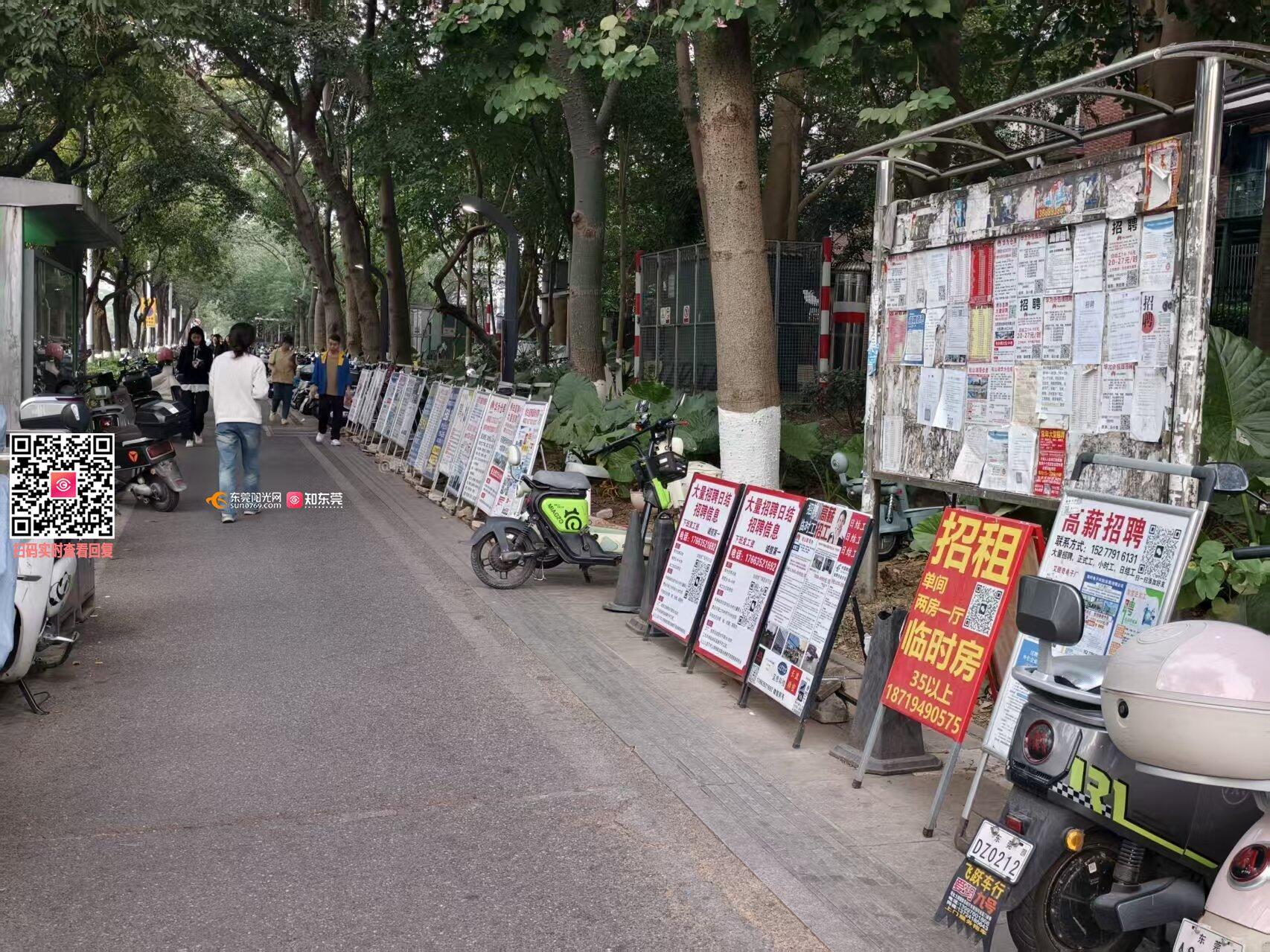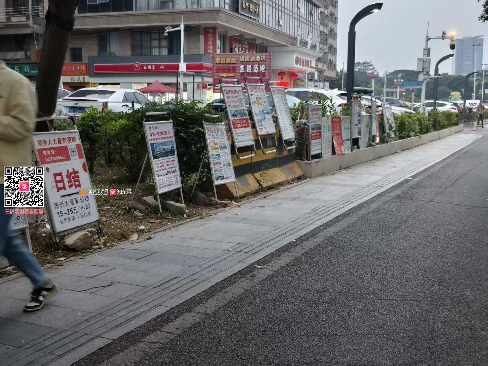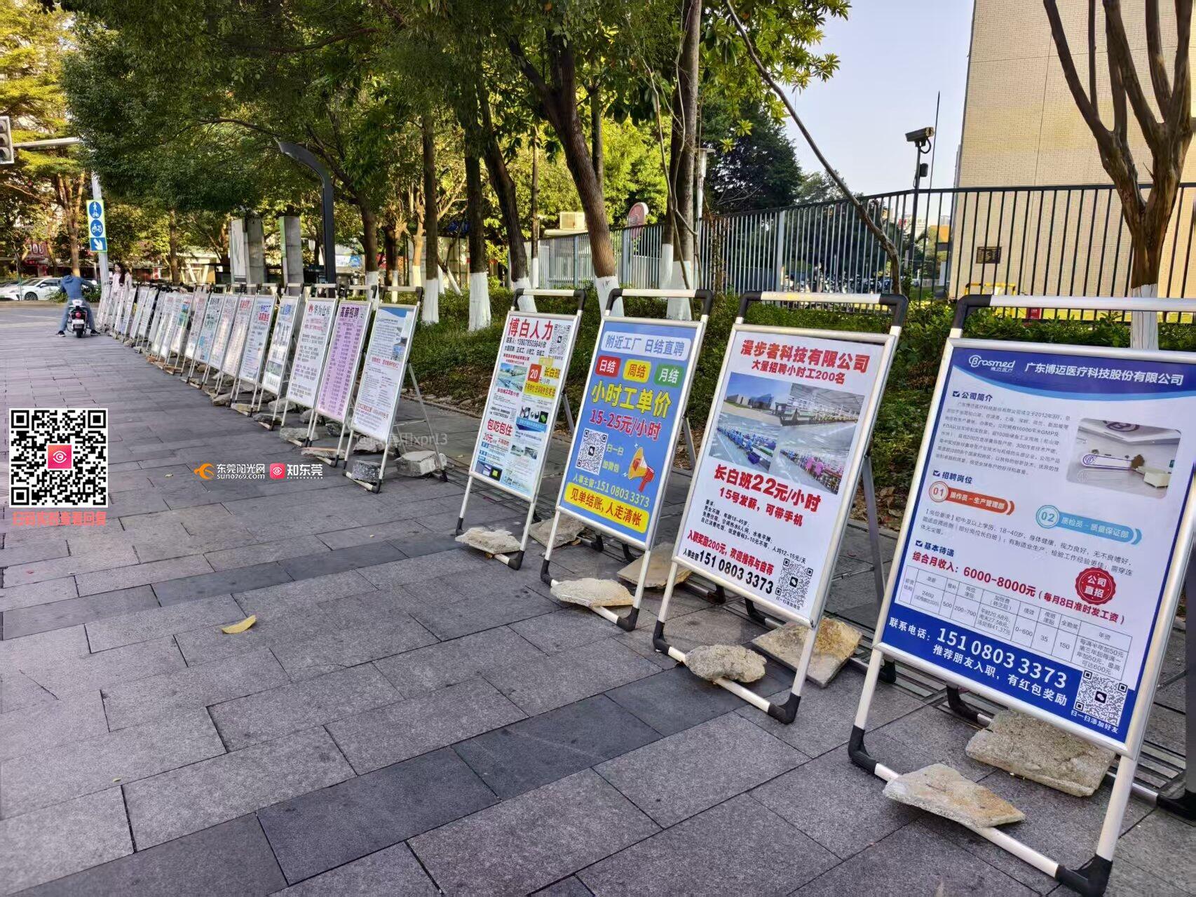 松山湖工业东路整条路上被中介公司多点摆放招工广告影响交通影响市容多次反馈,政府回馈加强巡查杜绝问题发生但实质上是没有人来处理只会摆拍,开始还到现场要求他们收走,下后面根本见不到有人到现场处理,工业东路大概有四五处地方摆放招工广告,分别是工业东路与工业北路交汇处转弯地方,青竹园公交站台后面,维纳酒店旁边新奥燃气仓库,邮政大厦门口等。这些招工牌的摆放不仅影响上下班同行人流量大更主要的他们占用盲道,所以拆除地砖作为他们的广告牌。我作为市民很矛盾这种行为难道是被领导们认可的不属于城市六乱现象?那么多的巡查人员和城市管理人员为什么没有人员感受到了就说明他们基本不下基层了,东莞市城管局提倡早发现早治理岂不成空头口号