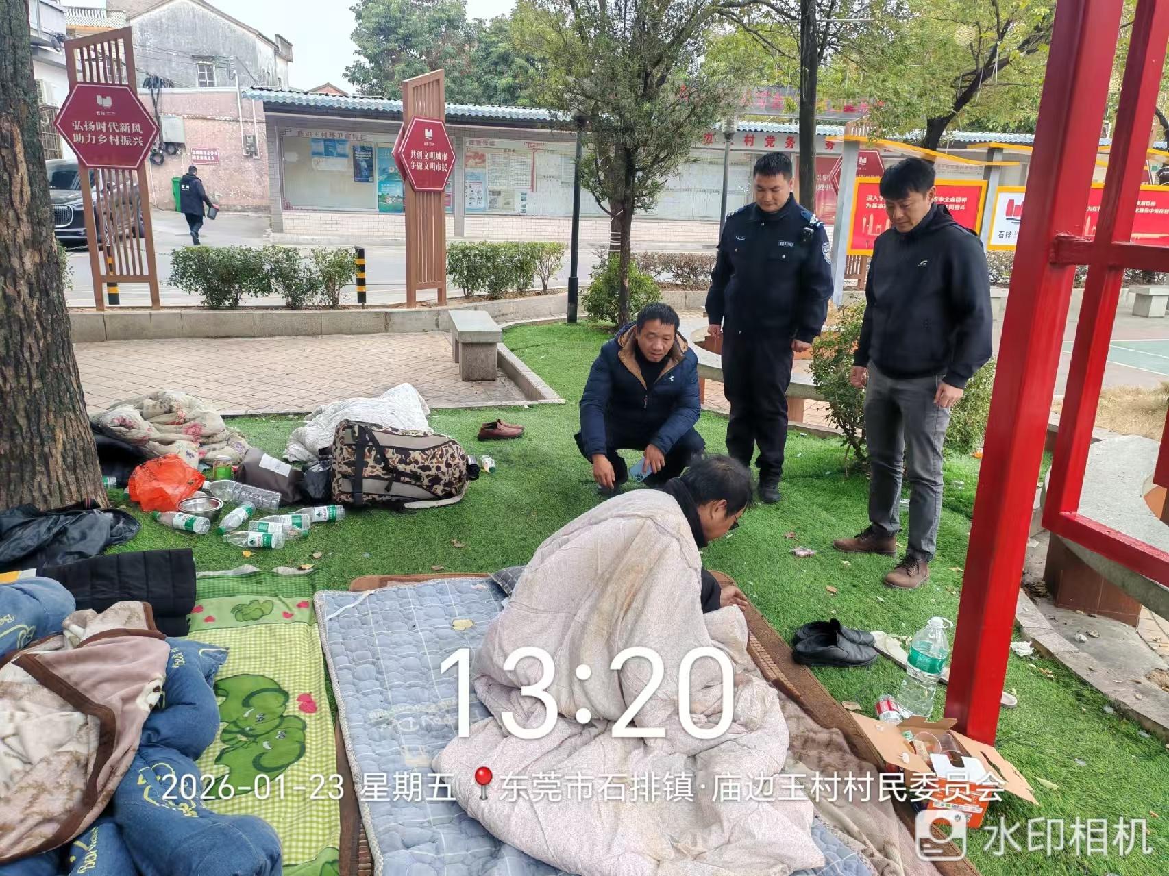 尊敬的市民,您好!您反映的问题已收悉,经石排镇庙边王村委会调查,现回复如下:收到反映的情况后,我们于2026年1月23日17:00联系市民,市民没有接听。经查,我村已派员到现场对露宿者进行劝导并引导其离开。接下来,我村将加强巡查,避免影响市民生活。如有疑问,请联系治安办公室,联系电话:86651124,感谢您对我们工作的理解和支持!
