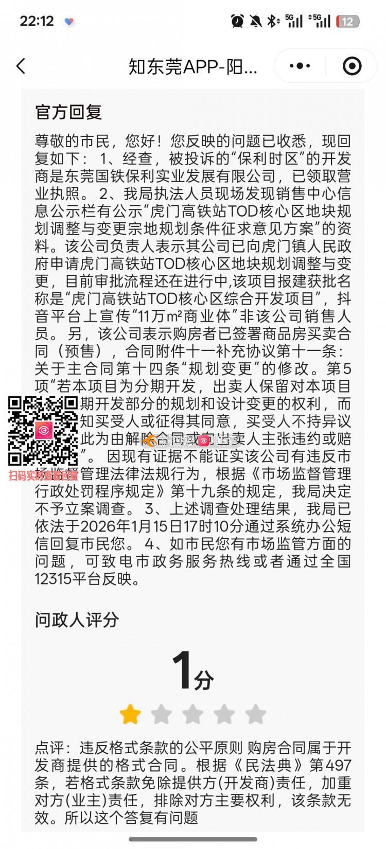 核心投诉:本人举报“保利时区”开发商虚假宣传,虎门市场监管分局以“证据不足”为由不予立案(编号562259)。该决定事实认定不清,理由自相矛盾。 主要事实与矛盾: 1. 宣传主体矛盾:分局采信开发商称“抖音宣传非其销售人员所为”。但事实是,抖音上存在认证为“保利时区 | 东莞国铁保利实业发展有限公司”的官方账号进行相同宣传。这直接否定了开发商的说法。 2. 宣传内容虚假:分局认为销售中心有“征求意见方案”。但开发商在1月9号协调会上已自认:“新规划未获正式批复”、“11万㎡商业体尚未建设”。用“审批中”的草案宣传“已确定”的配套,就是虚假宣传。 3. 调查程序不完整:分局结论主要依据开发商单方陈述,却未采纳能直接证明其虚假的关键证据——开发商自认的会议事实。调查不全面。 诉求:请求责令虎门市场监管分局撤销原决定,以“开发商官方账号宣传”及“其自认内容虚假”为关键新证据,对开发商的虚假宣传行为重新立案调查。