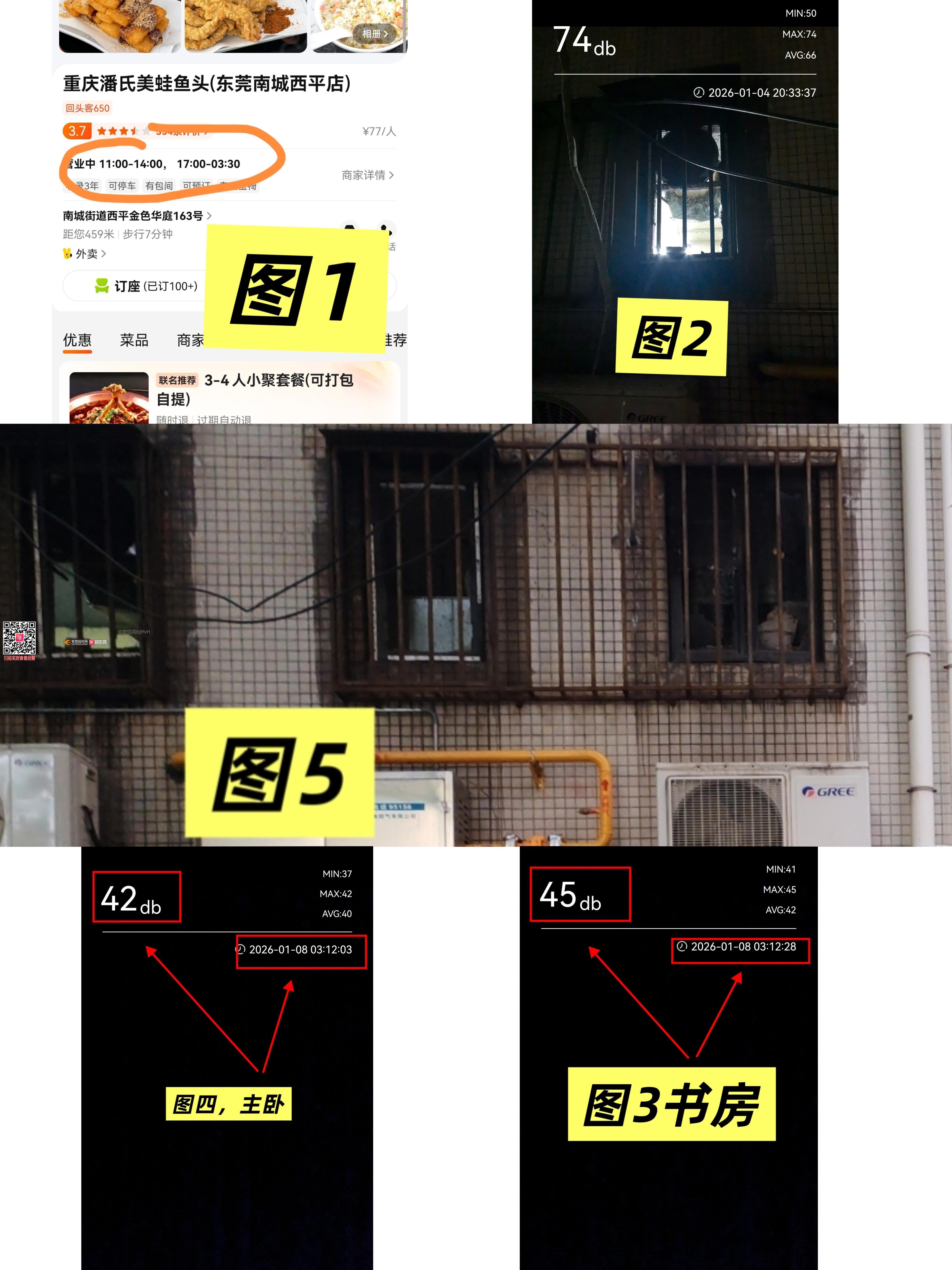 领导,您好! 本人系南城西平金色华庭小区合法业主,当前东莞正全力推进和美宜居城市建设,南城街道也在积极打造首善之区,而南城西平金色华庭小区宏伟路临街商铺“潘氏美蛙鱼头”餐厅自经营以来,其后厨高压炉罩及排风系统产生的噪音污染问题尤为突出,严重干扰居民正常生活;餐厅油烟排放情况虽有所改善,但仍存在轻微偷排行为。具体事实如下: 一、违规事实与危害情况 潘氏美蛙鱼头的后厨锅炉从上午十点多吵到次日半夜三点半(营业时间证明见图1美团截图),轰隆隆非常刺耳(晚上近测其后厨窗口录得分贝超70,高楼录得分贝超50,主卧和书房录得平均分贝均超40,采用手机APP录得不同时段空间噪音见图2.3.4)。该商铺炉罩对应区域窗户(面向小区内部)长期破损未安装(见图5),无任何隔音防护措施,高压炉罩运行时产生的高频气流声、低频结构噪音(通过建筑结构传递)昼夜持续扰民,夜间噪音尤为明显,严重影响小区睡眠休息,导致本人及家人出现失眠、烦躁等症状。本月已跟南城宏图居委会和小区物业初步反馈,物业上门进行查看,但目前仍与商铺处于沟通拉扯阶段,未得到任何实质性解决措施。 此外,关于该商铺油烟向小区内违法排放,经南城城管部门、社区、物业多方协调推动,餐厅油烟排放整改已取得一定进步,但尚未完全整改到位,仍存在轻微偷排行为,偶尔有异味扩散至小区,排风口设置未完全符合规范要求,未彻底消除油烟污染隐患。 二、投诉诉求 恳请贵部门依法履行监管职责,对潘式美蛙鱼头餐厅的违规行为进行立案查处,并采取以下措施: 1.依据相关法律法规,进行有效整改,彻底解决噪音扰民问题; 2.针对油烟轻微偷排问题,杜绝直对小区排放,确保油烟净化设施正常运行; 3.确保整改效果符合GB 22337—2008《社会生活环境噪声排放标准》及餐饮油烟排放相关标准; 4.若餐厅逾期未整改、整改不合格,或拒不配合查处,恳请贵部门依法持续跟进。
