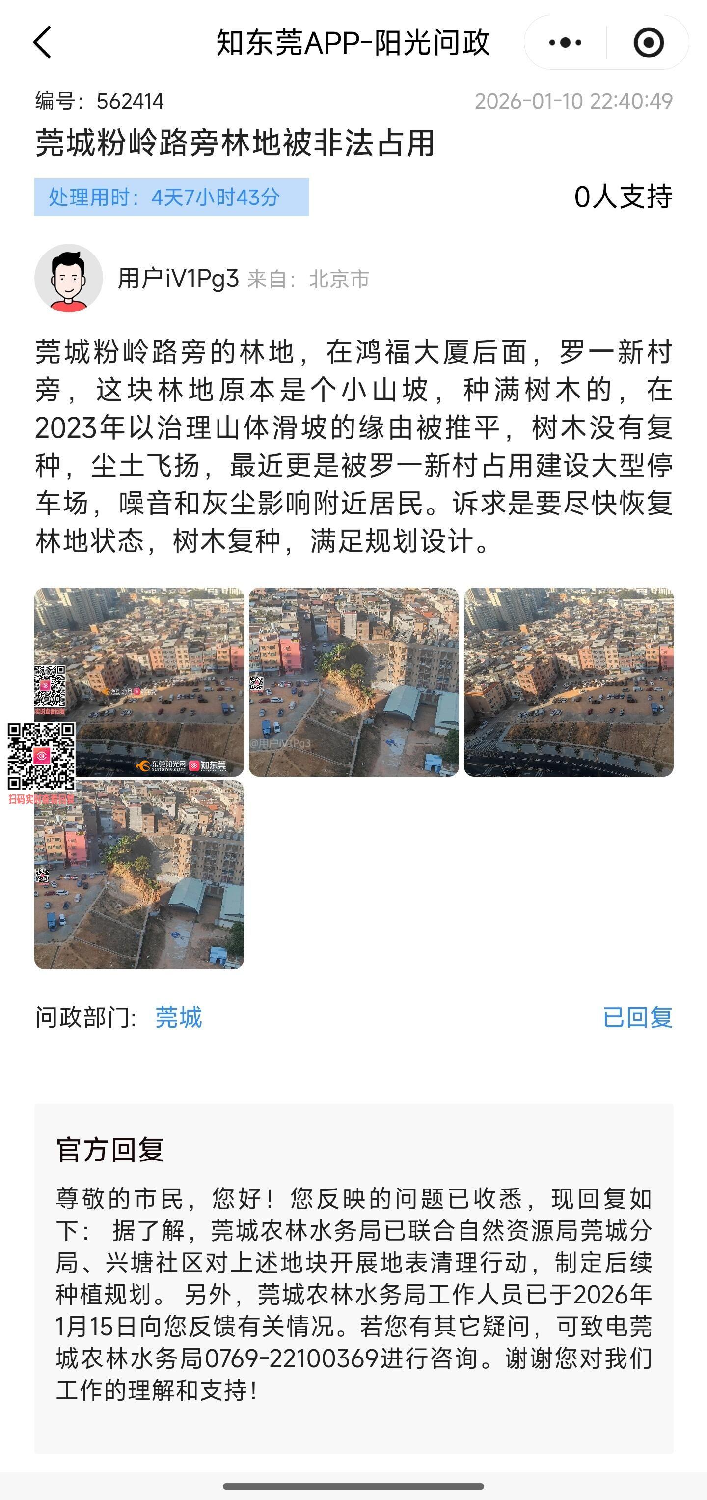 莞城粉岭路旁的林地,在鸿福大厦后面,罗一新村旁,这块林地原本是个小山坡,种满树木的,在2023年以治理山体滑坡的缘由被推平,树木没有复种,尘土飞扬,最近更是被罗一新村占用建设大型停车场,噪音和灰尘影响附近居民。诉求是要尽快恢复林地状态,树木复种,满足规划设计。 2026/1/15收到官方回复,如附图1,说已进行地表清理,实际毫无变化,这是弄虚作假回复人民群众! 其次,回复提到会制定后续种植计划,然而不提进度以及目标完成时间,这就是空头支票! 最后,没有任何莞城农林水务局的工作人员电话联系我进行沟通。我手机通话记录截图如附图2。真的是谎话连篇!