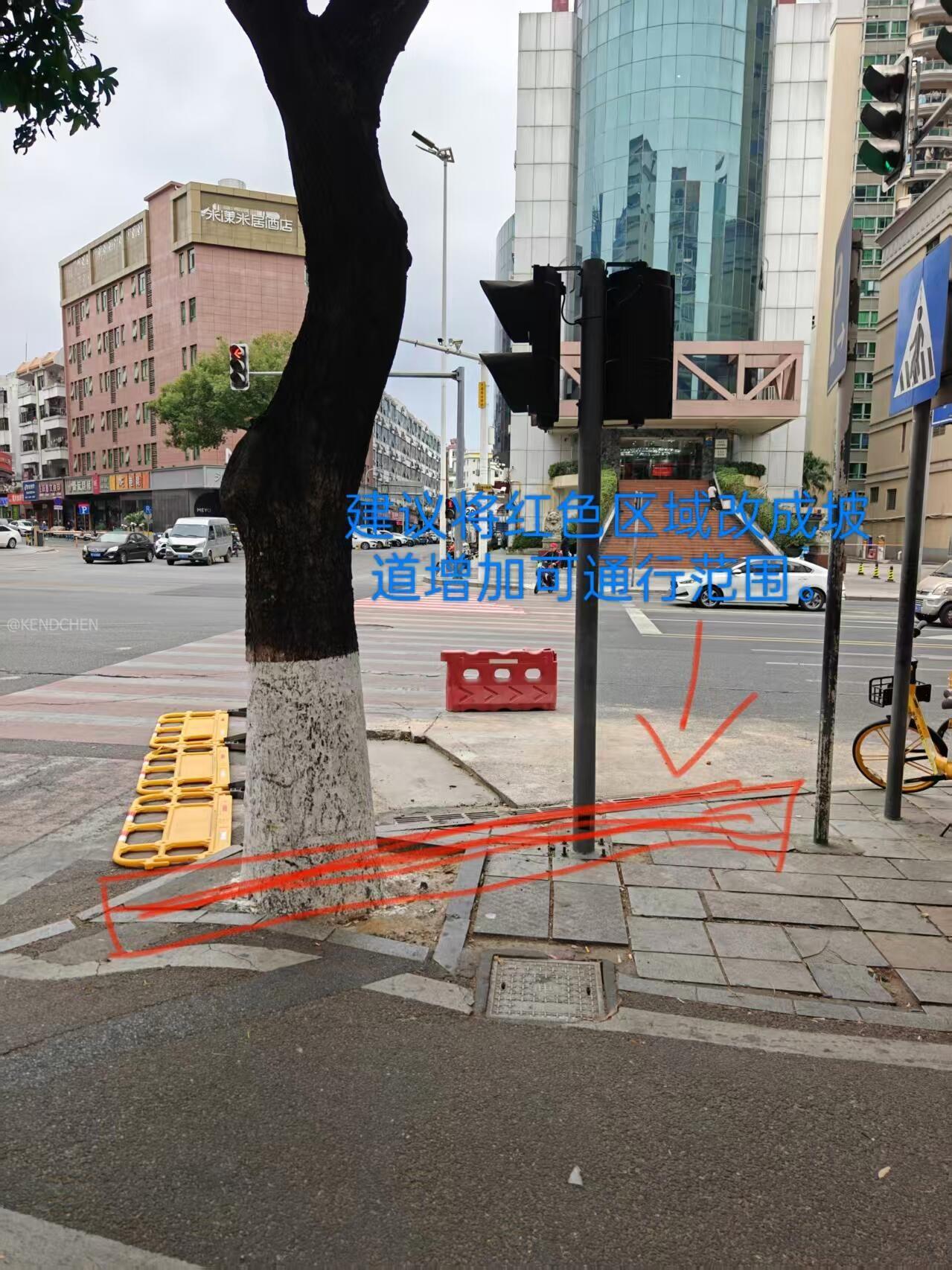 在莞城轻出商业大厦停车场,一侧的斑马线(市自然资源局对面)与行人道之间设计不够人性化,缺少坡度与斑马线衔接,且有树木及标示牌阻挡,导致从这一侧通往市自然资源局的自行车及电动车需在路面的斑马线上等候通行,建议增加坡度面积,优化标示牌位置。