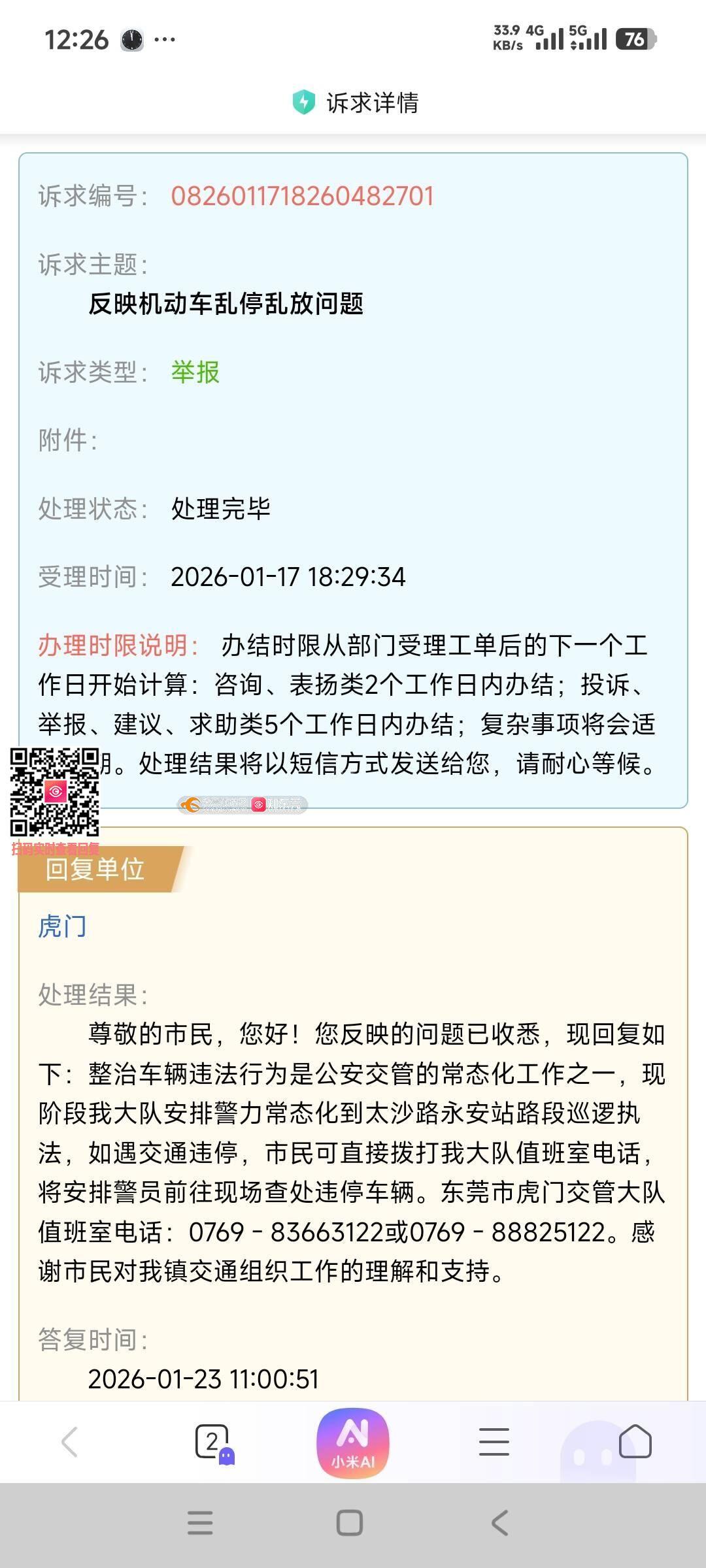 此前已通过东莞12345政务服务便民热线 反映该问题,但截至发函之日,该路段公交站台违停乱象未得到任何整改,问 题依旧突出,严重影响市民正常出行及道路交通安全,恳请相关部门高度重视,立即采取有效措施彻底整治。 虎门太沙路为虎门镇核心交通路段,沿线公交站台是周边居民、商户、通勤人员日常乘坐公交的重要设施。当前该路段公交站台及周边区域被各类社会车辆随意停靠、长时间占用,存在以下突出问题: 1. 公交无法正常进站,只能在机动车道临时上下客,不仅严重影响公共交通运营效率,还导致公交车与过往车辆混行,极易引发交通拥堵; 2. 候车市民因站台被占,被迫在机动车道内候车、上下车,尤其老人、儿童及非机动车骑行者,时刻面临被过往车辆碰撞的安全风险,交通安全隐患极大; 3. 违停车辆多为全天性、常态化占用,即便在交通高峰时段,该现象也未得到遏制,周边市民多次避让险象环生,民生诉求迫切。 此前通过12345热线反映问题后,虽收到受理反馈,但未见到相关部门到现场开展实质性整治工作,违停车辆依旧肆无忌惮占用公交站台,未形成任何管理和震慑效果,让市民对问题解决的时效性和有效性深感失望。 公交站台是城市公共交通基础设施,社会车辆违规占用的行为已违反《中华人民共和国道路交通安全法》相关规定,同时严重侵害了广大市民的公共出行权益。基于此,本人提出以下明确诉求,恳请相关部门落实责任、快速处置: 1. 立即安排工作人员到虎门太沙路涉事公交站台现场核查,对当前违停车辆依法进行劝离、处罚,及时清理公交站台及周边违停乱象; 2. 对该路段采取常态化巡逻管控措施,增加高峰时段巡查频次,对公交站台违停行为形成长效监管,杜绝问题反弹;