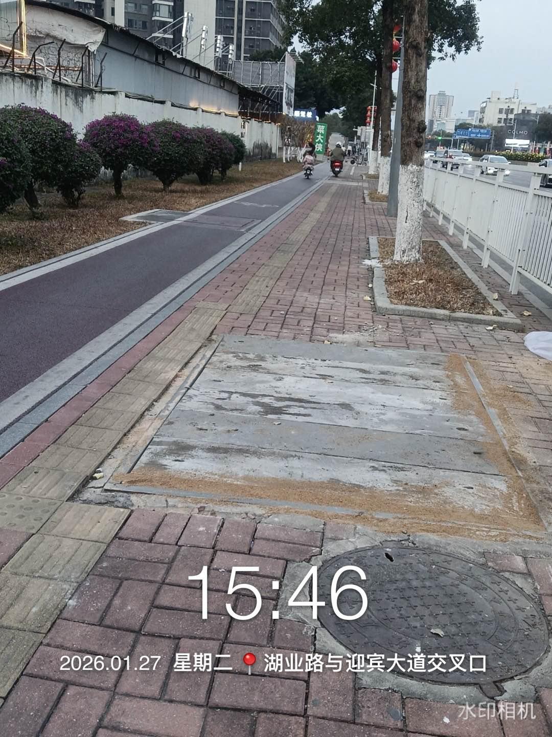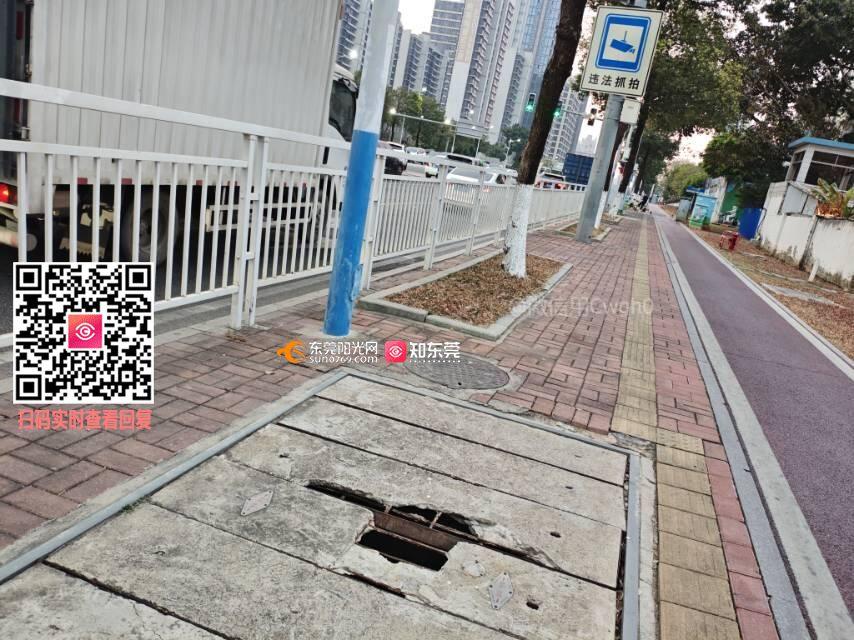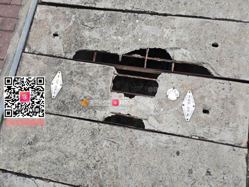 在塘厦湖业路与迎宾大道交汇口往左转,也就是说从湖业路出来迎宾大道后往左转,走到第2个水泥井盖,这个水泥井盖的水泥破了非常大一个洞,这个窟窿足够人的两只脚伸下去!万一晚上光线不好有人颠万一晚上光线不好,有人边走路边看手机,万一掉下去或者受伤了可就是个大问题!有关生命安全!!!