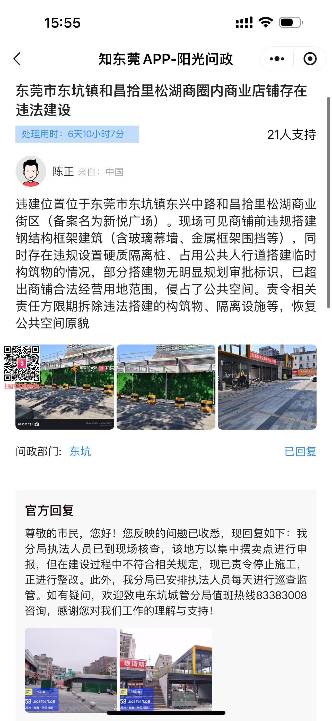 关于东莞市东坑镇城管分局公示东莞市东坑喜悦里商业广场违章建筑处理方法,将此违章已建成且已具备永久性商业店铺性质强行更改为商业广场摆卖点必须符合的规定,请相关主管部门回复一下。 1. 是否取得规划与管理方的同意 部门报备审批:需向属地城管部门报备或申请。根据市级“疏堵结合”的指导意见,城管部门应当进行现场勘查和指导。 是否有申报审批手续?是否存在先建项目后在申报等违规操作? 2. 是否严格遵守限制性规定 · 不改变主体性质:不能改变广场的主体建筑结构和规划用途(如将停车场或市民娱乐休闲广场永久改为商铺)。 · 不占用核心通道:严禁占用消防通道、疏散通道、盲道等。 · 不损害公共利益:必须严格管理,避免噪音、油烟、卫生问题扰民。营业时间通常有限制。 3.商业广场设立摆卖点且不与原有商业规划产生实质性冲突。 4. 违章搭建的建筑物或临时搭建物是否违反了中华人民共和国《公路安全保护条例》。 5. 符合城市的宏观导向 此类摆卖点是否符合东莞市关于 “规范流动摊贩管理” 和 “发展夜间经济” 的总体政策方向。 此栋违章建筑物不在其自有红线范围内,且建筑结构为永久性水泥,钢结构混合体二层建筑。 而且此违章建筑已经改变了土地和主体建筑的规划用途与性质。违法建筑设施没有具备可移动、可拆卸的便利性。 违反了中华人民共和国《公路安全保护条例》,及临时搭建的违法建筑用地规划距离国家规定的县级道路(X246)不少于10米。根据东莞市2025年最新的城市规划管理方法。第三十二条 严格控制临时建设工程或临时搭建物包括临时建筑审批。临时建设工程或临时搭建物,必须符合下列规定:(一) 不得擅自占用城市现有或规划道路、内街及建筑退缩地带。