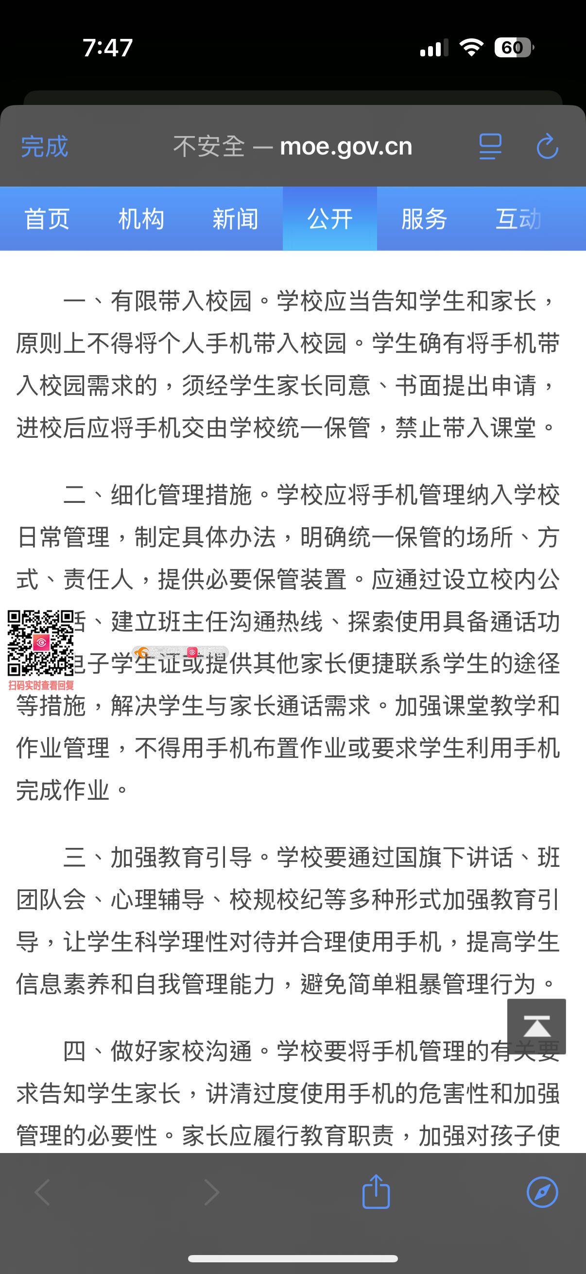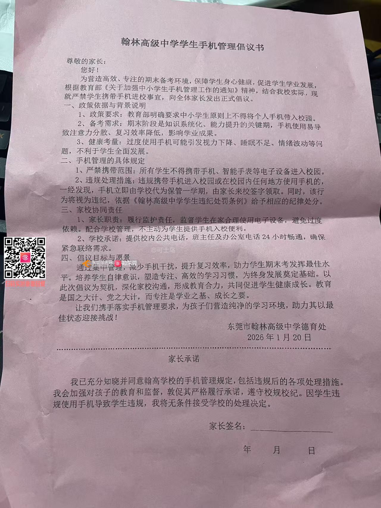 翰林高级中学不给任何学生带手机入校,教育部在2021年发布的《关于加强中小学生手机管理工作的通知》并未直接、绝对地规定“不给手机入校”。其核心精神是“原则上禁止,例外可申请,校内统一保管” 同时活动中提到“学校应提供校内公共电话、班主任沟通热线等,解决通话需求。”但是学校的电话机只能拨打5分钟,而且在一定时间内关闭。 教育部的通知中是“原则上不得”“有限带入校园”,留有申请入口,强调引导。但学校规定“严禁携带”,未体现例外申请程序,措辞绝对。不给特殊学生选择空间。
