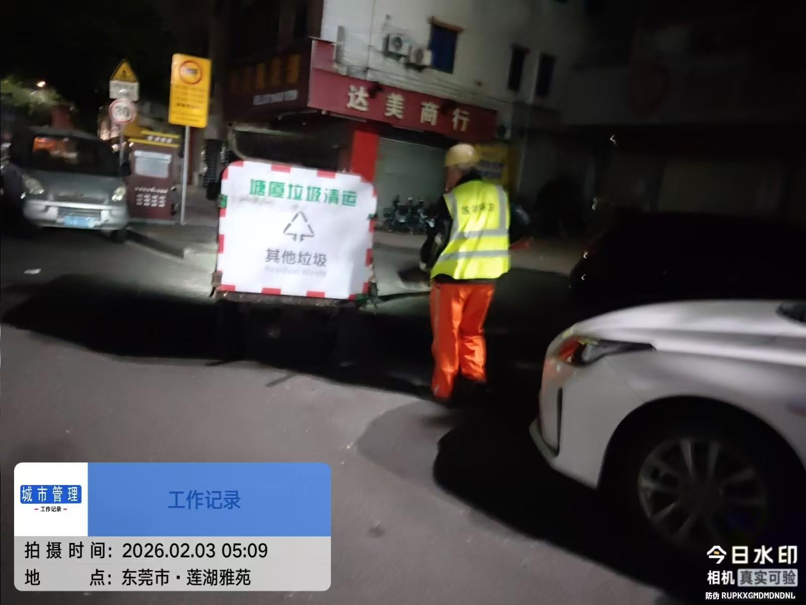 尊敬的市民,您好!您反映的问题已收悉,现回复如下:收到反映的情况后,我们于2026-02-03 对诉求进行办理。经向环卫部门了解,此点垃圾特别多,如果在8点后清运会造成垃圾溢出满地垃圾,污水横流,到时占用更长的垃圾清理时间,在出行高峰期将造成交通堵塞,社区已通知环卫部门加快清理,减少对附近居民影响。如有疑问,请联系莲湖社区,联系电话:87922923。感谢您对我们工作的理解和支持!