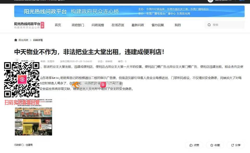 没有经过业主允许把大门分出去一大半给别人开便利店,所有收益都被中天收入囊中,不只大门违建的收益,其他的收益这么多年都没有公开,物业费没有开过发票,请求严查,还有时候威胁业主不交水电费他们会采取停水停电,我们养他们,至今都是我们在听他们的话,还有我们是住宅小区,不是商业写字楼,二楼饭店为什么把我们住宅的电梯公开使用,这样我们的小区安全性在哪里,有时候喝醉酒吐的电梯到处是的,请求处理,请求严查这些不作为的物业