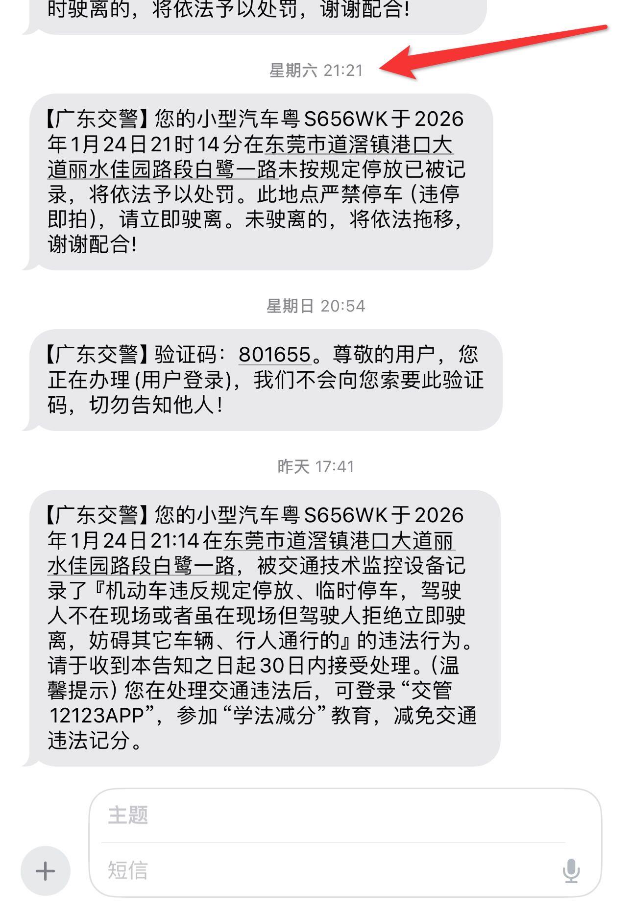 1月24号晚9点,我去道滘办事,在丽水家园小区附近,看到马路宽阔,并且有几台车也是停在对面马路边,道路护栏旁边空地并有画白线,误以为是车位,就把车停在那里了,晚上9点21分接到短信提醒挪车,我立刻跑过去挪车,然后看到车已经被贴条了,对此提出几点质疑,望相关部门温情处理。 一 , 我停车地面周围没有画禁停标志或者斑马线,只是画了白线,让我误以为那里是停车位,对周围环境不了解,而且对面也有几台车直接停在了斑马人形线上,但是其他车并没有被处罚,涉及是否工作人员执法问题。 二,我在晚21点21分收短信提醒,21点27分就跑到现在并拍照挪车,6分钟时时间,但是直接给了我罚单,没有任何时间给我挪车,有手机短信于情于理不合适。 三, 晚上周围马路开阔,并未涉及到影响交通 ,影响出行,同一条丽水家园路段,甚至很多车直接停在斑马线上停满(最后一张图我有拍照证明),也并未被罚,希望给市民一个温情的处理,免于处罚,共建和谐社会。