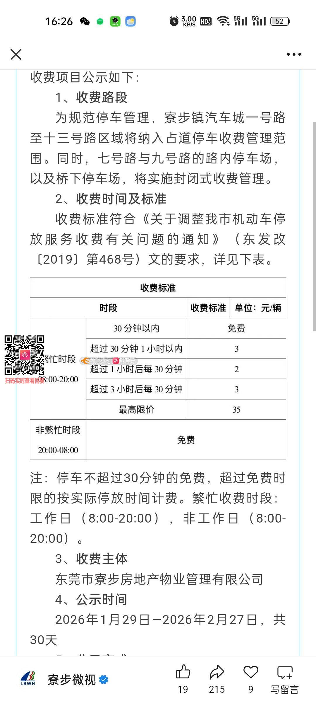 尊敬的市民,您好!您反映的问题已收悉,现回复如下:关于停车收费的投诉回复以下,寮步镇汽车城道路机动车停放服务收费目前为公示期间并未正式开始实施收费管理,公示期间市民提出的各种意见我们将会认真考虑,并根据《市政公共资源有偿使用收入管理办法》等相关法律法规和管理办法,制定停车管理服务方案,经相关部门审核通过再执行。感谢您对我们工作的理解和支持!