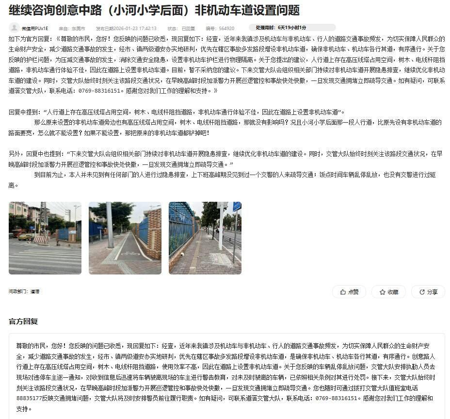 连续两次反映创意中路非机动车道问题,官方回复一字不差,当老百姓是傻*,相关部门严重地懒政、怠政,有问题不处理,******,忽悠老百姓!得严肃问责! 重申诉求:将斑马线至红绿灯的那一小段非机动车道,引导至上面人行道!把右转车道还路于民!