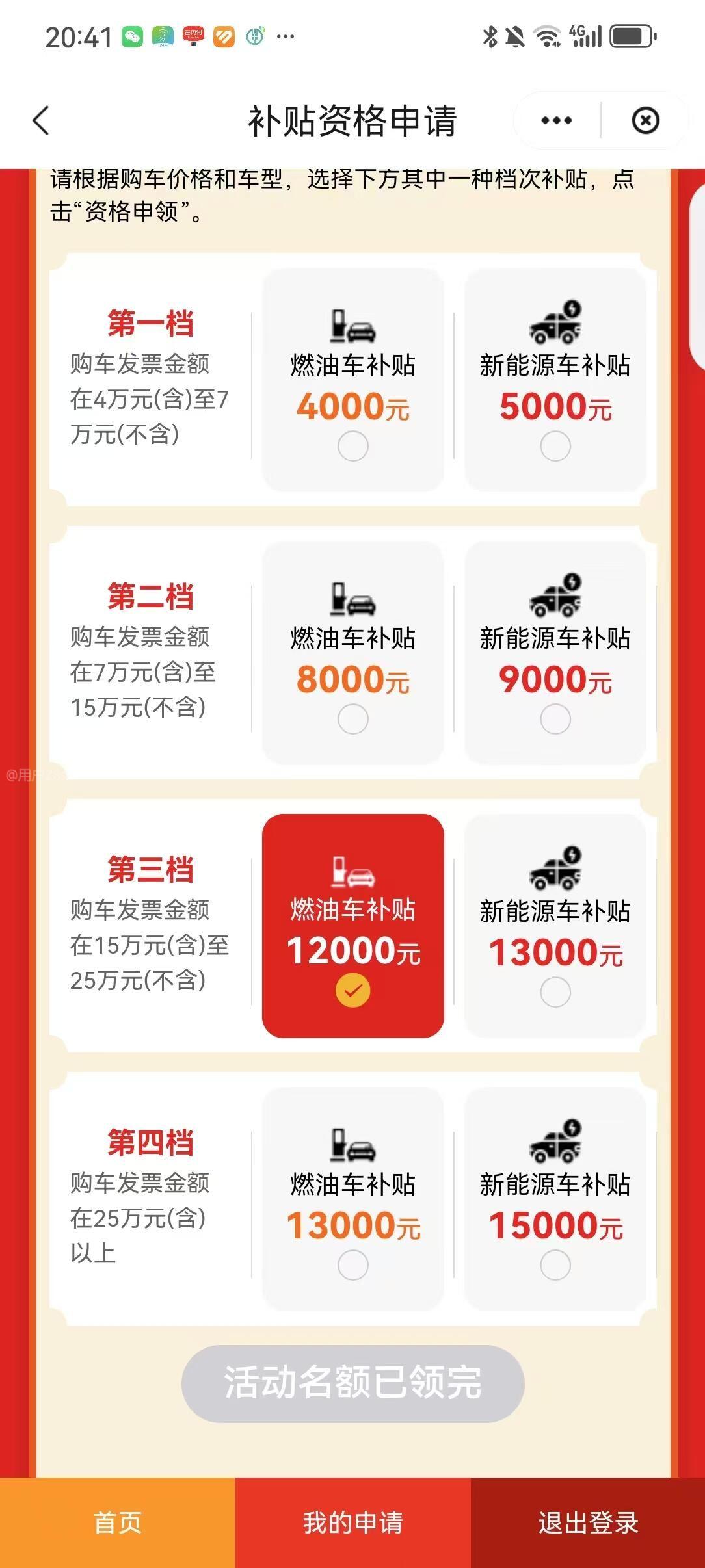 4、现在进入粤换新,点补贴资格申请---第三档燃油车,显示活动名额已领完。