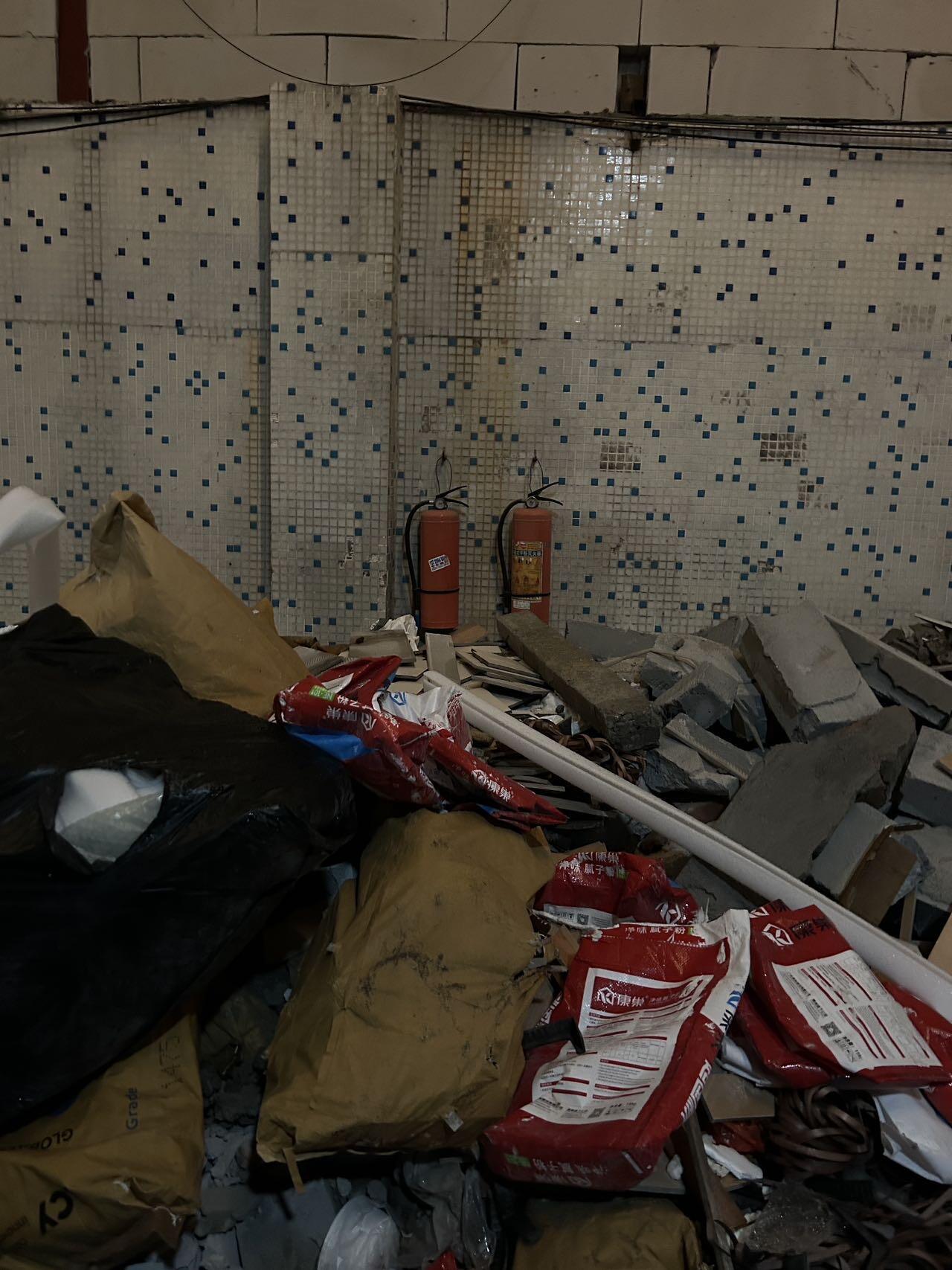 灭火器被建筑废材挡住,旁边就是电动车充电站,万一发生火灾想要拿灭火器都不能及时安全地拿到灭火器,更别说消防车能不能进来了。存在严重的消防安全隐患。想试问一下小区老板是不是和社区存在某些包庇的合作关系呢?新塘社区的网格员是否有尽职尽责?天天看到他们网格员四处走访,这么明显的消防安全隐患直接坐视不管?