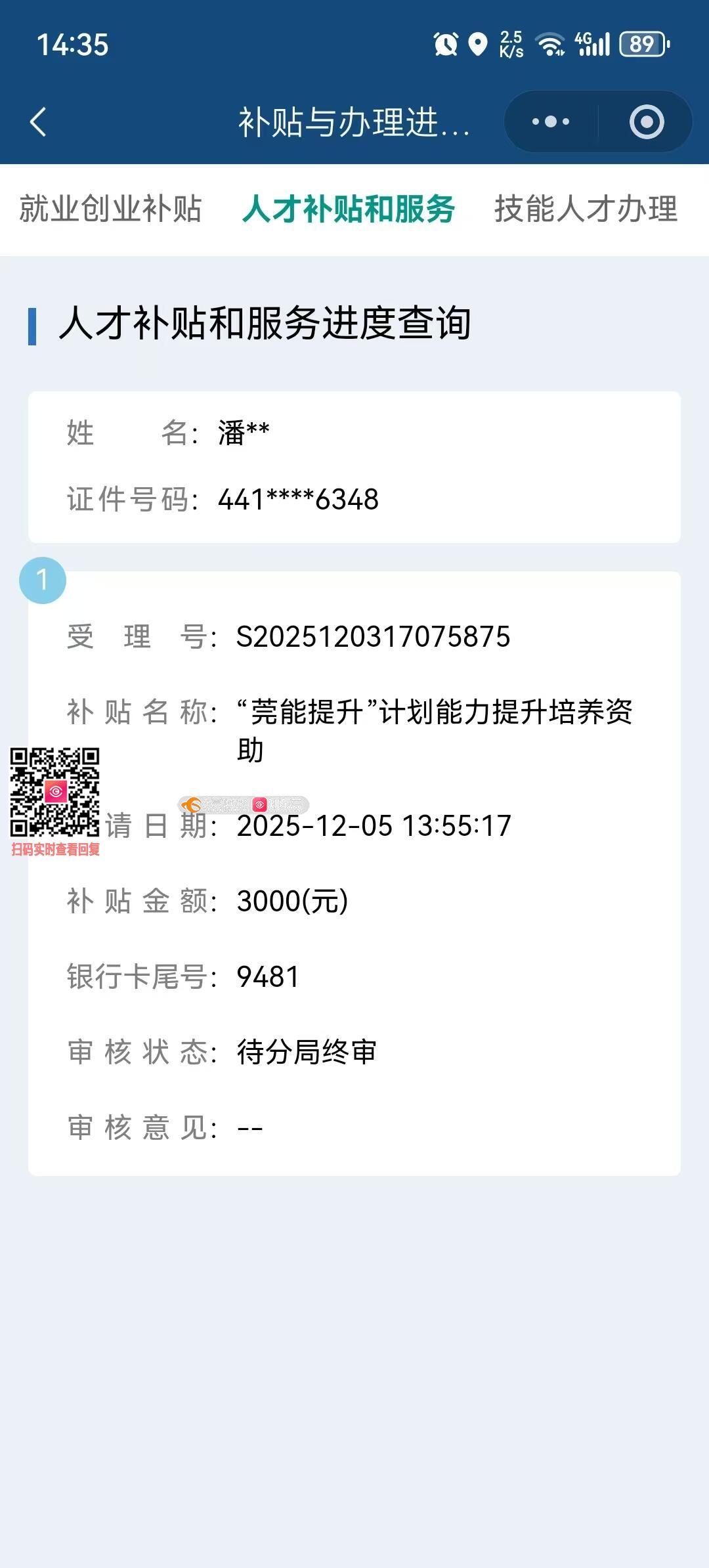 您好,您的来信已收悉!根据您咨询的内容,我局回复如下:您已成功提交申请并生成流水号的,可通过微信小程序“就莞用”查询审核进度。进入小程序,点击“人才补贴和服务进度查询”,登录后查询对应申报记录,确认申报记录后申请人无需重复提交申请。目前您提交的申请流水号为:S2025120317075875,目前您的申请已审核通过,请耐心等待后期公示!若有其他疑问可咨询市人社局人才服务科,电话:22820828。感谢您对我局工作的理解与支持!