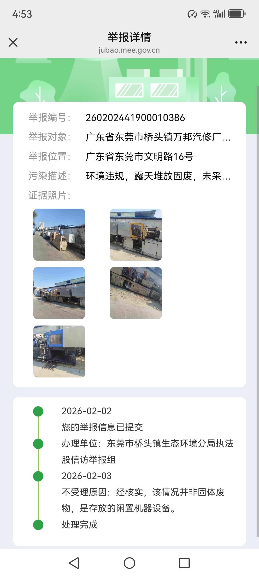 尊敬的市民,您好!您反映的问题已收悉,现回复如下:我单位工作人员于2026年2月5日10:45电话与您取得联系,您反映“桥头镇文明路16号万邦汽修厂环境违规,你们说不是固废,请问一下,第一,台账,第二,未采取三防措施,这样堆放不违法吗,机械流出油味,空气飘飞,金属,和,机油味,不算大气污染吗,你们这样判断,好多都不算”的问题。2026年2月6日我单位工作人员到现场进行处理。经查,被投诉单位为二手设备仓库,位于东莞市桥头镇文明路16号,现场没有设置工业生产工序或设备,仅临时存放二手设备待售,也未发现固体废物违规堆放的情况,现场要求该单位做好日常管理工作。下来,我分局将不定期对该单位开展巡查,如发现存在环境违法行为,将依法处理。如有疑问,请联系东莞市生态环境局桥头分局,联系电话:0769-81022993。感谢您对我们工作的理解和支持!