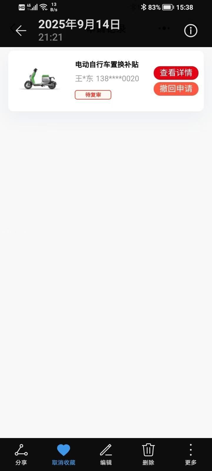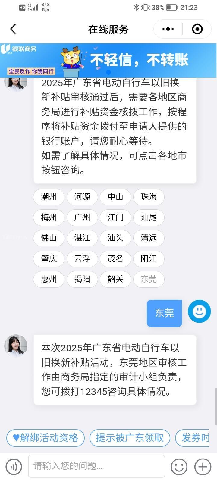 本人于2025年3月响应国家要求置换国标电动自行车。提交电动自行车置换补贴申请,一直没审核通过,隔一段时间打开粤焕新小程序,要么显示审核不通过,要么就是审核中。逾8个月,仍未收到任何正式回复或处理结果。期间咨询过电动车店老板和在线查询,被告知“耐心等待”。偶尔看到审核不通过后再次选择重新递交,仅获“处理中”等模糊答复,无具体进度安排和具体哪里出现问题,直到活动结束才被告知:商务局“有五次通知资料不符合,合格证需要发正面图片”,补贴活动已经结束。事后推测,这些所谓的通知,只要是不及时打开小程序查看,过一段时间这个通知就会消失,然后有回到“审核不通过”界面,你即使点开这个界面也不会看到“哪部分的资料不符合”。 此做法明显有问题,市民从刚刚开始的每天上小程序打开查看,都后面每周打开查看,再到后面每个月打开查看,只要不及时打开“告知”页面,即使你看到“审核不通过”而点开,也看不到“审核不通过的原因”,从而无法得知“审核不通过的原因”,有截图为证。申请不通过的理由应该长期显示在审核页面上,方便市民点开查看。恳请贵局重新审,批准重新审核,获得补贴,因为本人的资料不是不符合补贴审批资格,而是不符合上传条件。同时加强内部管理以提高办事效率。谢谢 “粤焕新”活动平台回复:先后于5月14日、5月28日、7月6日、10月16日、12月4日反馈您的2025年电动自行车以旧换新活动补贴失败原因。 实际:这些所谓的通知,只要是不及时打开小程序查看,过一段时间这个通知就会消失,然后有回到“审核不通过”界面,你即使点开这个界面也不会看到“哪部分的资料不符合”。 此做法明显有问题,市民从刚刚开始的每天上小程序打开查看,都后面每周打开查看,再到后面每个月打开查看,只要不及时打开“告知”页面,即使你看到“审核不通过”而点开,也看不到“审核不通过的原因”,从而无法得知“审核不通过的原因”