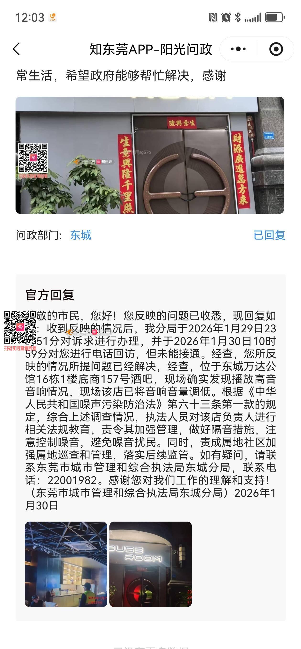 尊敬的市民,您好!您反映的问题已收悉,现回复如下:收到反映的情况后,我分局于2026年2月10日00时47分致电您未能接通,并于2026年2月10日00时47分对诉求进行办理。经查,位于东城万达公馆16幢东莞东城万达广场南底商酒吧,现场该店已关门未营业,未发现噪音扰民情况。下来,我分局将继续派员加强对该路段的日常巡查。如有疑问,请联系东莞市城市管理和综合执法局东城分局,联系电话:22001982。感谢您对我们工作的理解和支持!(东莞市城市管理和综合执法局东城分局)2026年2月11日
