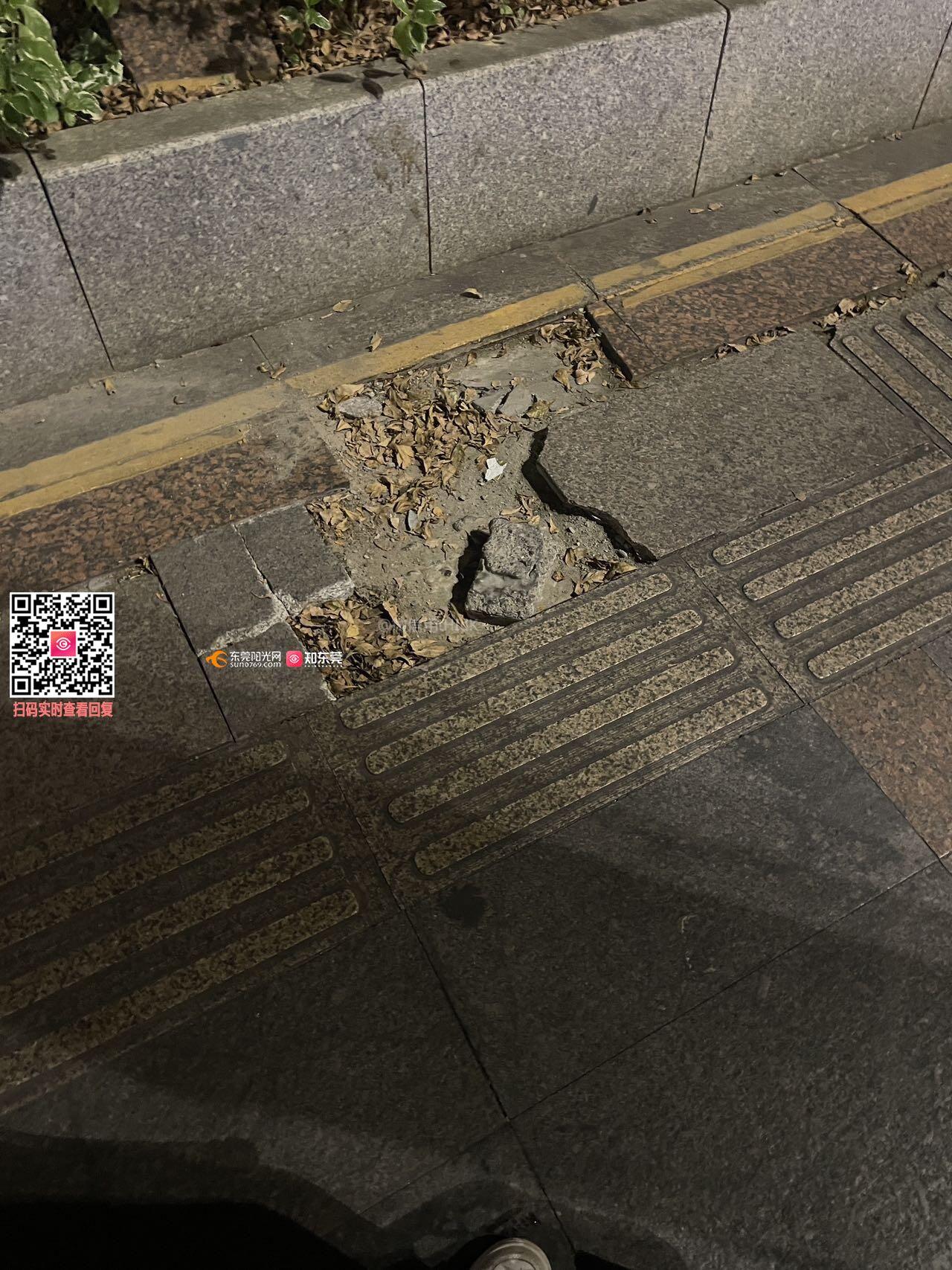 美景中路-帝豪酒店公交站 往大朗社区医院方向走10米(靠近帝豪酒店这侧),人行道有地砖碎掉了,只留下了洞在那