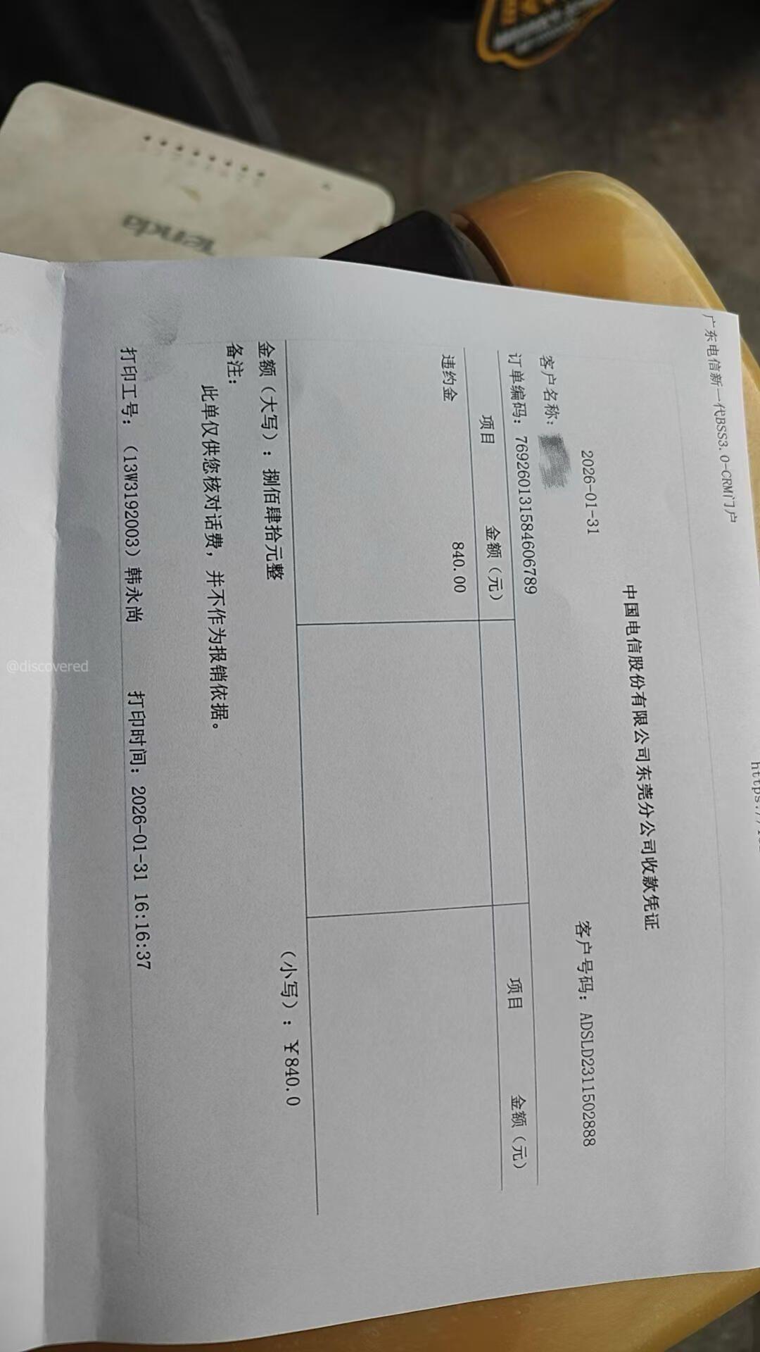 2018年在塘厦开店,当时以店铺工作人员的名义拉了一条电信宽带,2021年宽带升级,月套餐费用高达400元,我也都按时每月缴费了。现因生意难做,且店铺合同到期,店铺工作人员1月31日去塘厦电信营业厅注销电信宽带,办理时被要求交840元的违约金。注销还要交违约金,真是闻所未闻,在移动和联通宽带都没听说过,以前开通时也没有告知要缴纳违约金。对于交了违约金的情况,本人不予认可,要求贵司全额退还。