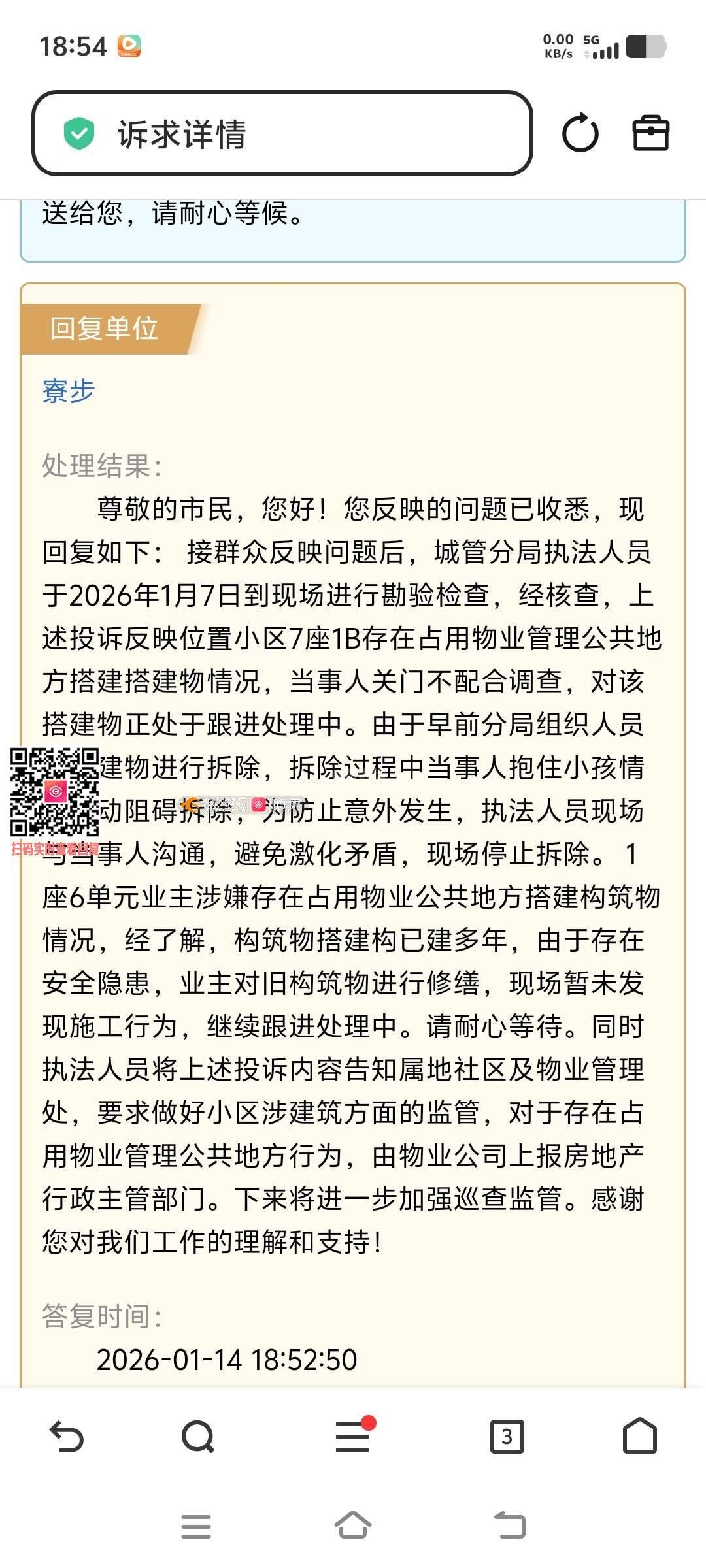 尊敬的市民,您好!您反映的问题已收悉,现回复如下: 城管分局执法人员于2026年2月10日到现场进行勘验检查,经核查,上述投诉反映位置存在占用物业管理公共地方搭建搭建物情况,现场暂未发现新建筑行为。由于早前城管分局组织工作人员对搭建物进行拆除,拆除过程中当事人抱住小孩情绪激动阻碍拆除,为防止意外发生,分局工作人员现场与当事人沟通,避免激化矛盾现场停止拆除。对该搭建物正处于进处理中。对于小区一楼业主存在占用物业公共地方搭建构筑物情况,经了解构筑物搭建构已建多年,由于存在安全隐患,业主对旧解构筑物进行修缮,现场暂未发现施工行为。分局已就小区1楼相关问题开展调查中,将根据调查结果进一步处理。同时要求小区物业管理处加强监管,继续做好物业管理工作。 下来我分局将进一步加强巡查监管。感谢您对我们工作的理解和支持!