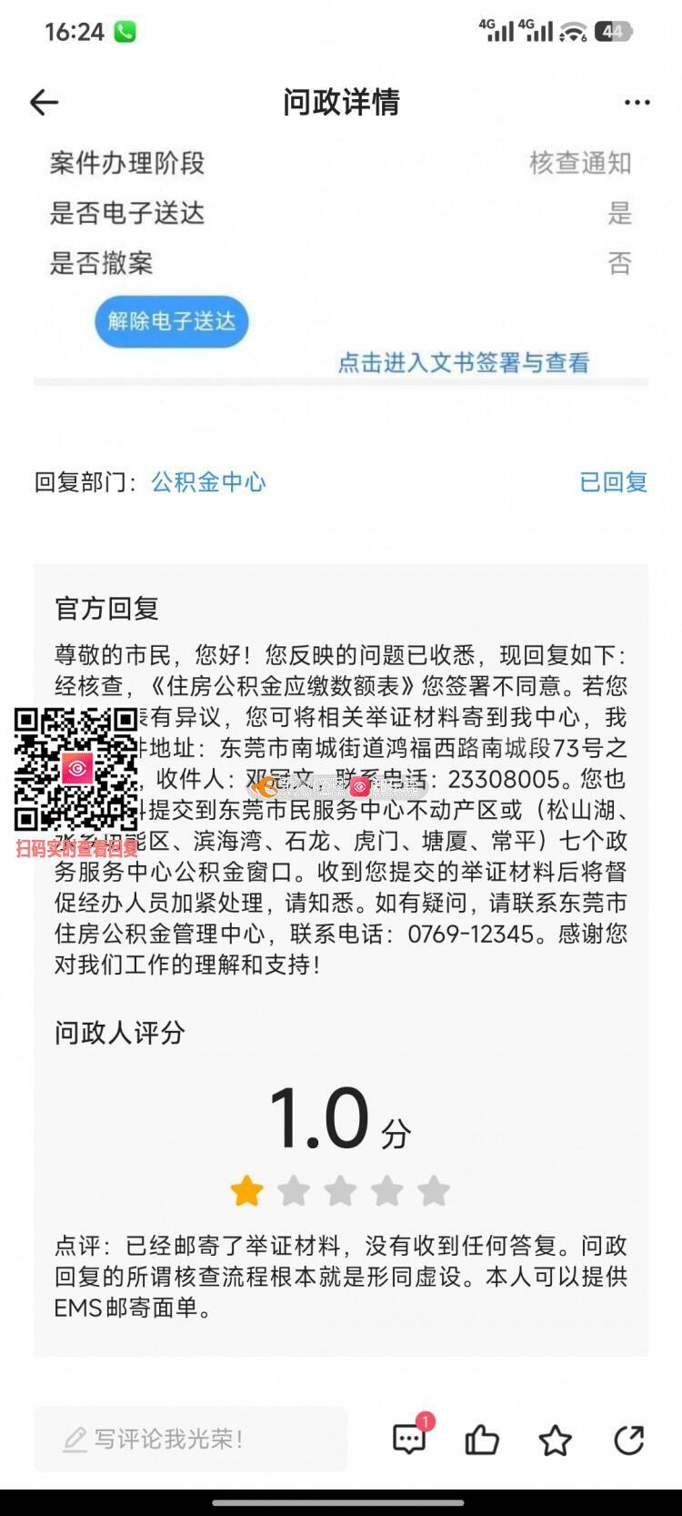 本人在2026年1月11号就邮寄了公积金异议相关举证材料。可是问政答复却是让我有异议可以邮寄材料。 证明东莞公积金中心的办事效率是如何?东莞公积金中心在监管主动性、办事效率、政策灵活性和服务态度上,仍有巨大的改进空间。 东莞公积金中心若自称“政务部门服务地板砖”,恐怕无人敢争——毕竟能把“监管靠举报、办事靠运气、政策像迷宫、态度像冰箱”做成标准化体验的。