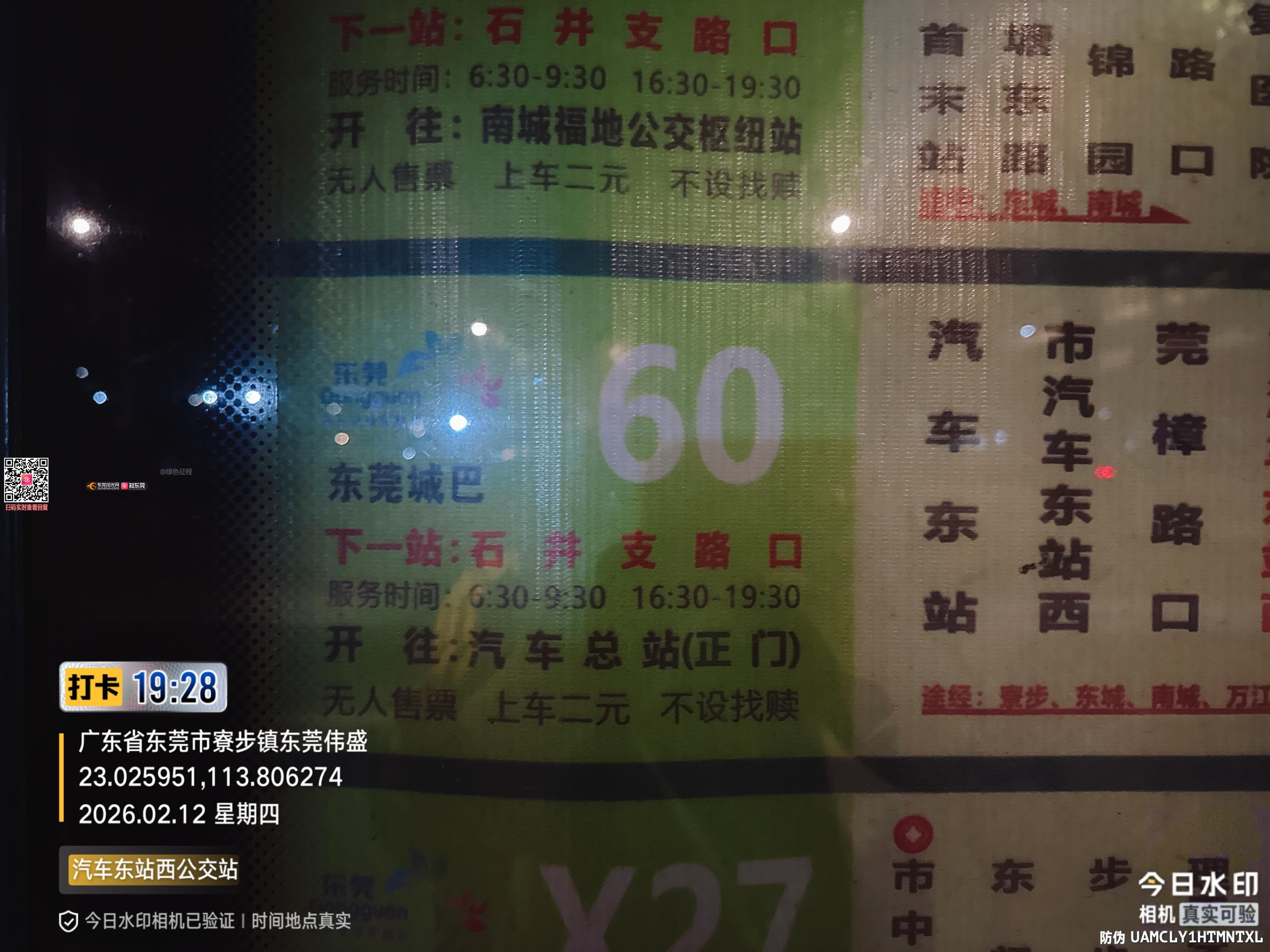 2月12日晚上7点在汽车东站西公交站等60路公交车,APP发车时间显示19:05有一趟发车,结果过了这个时间没有发车,下一趟显示发车时间19:13分,继续等这一趟也没有发车,最后等到快19:30分,因赶时间就打网约车走了。强烈投诉东莞公交车这种不按时发车的行为,浪费乘客时间,影响东莞城市形象!