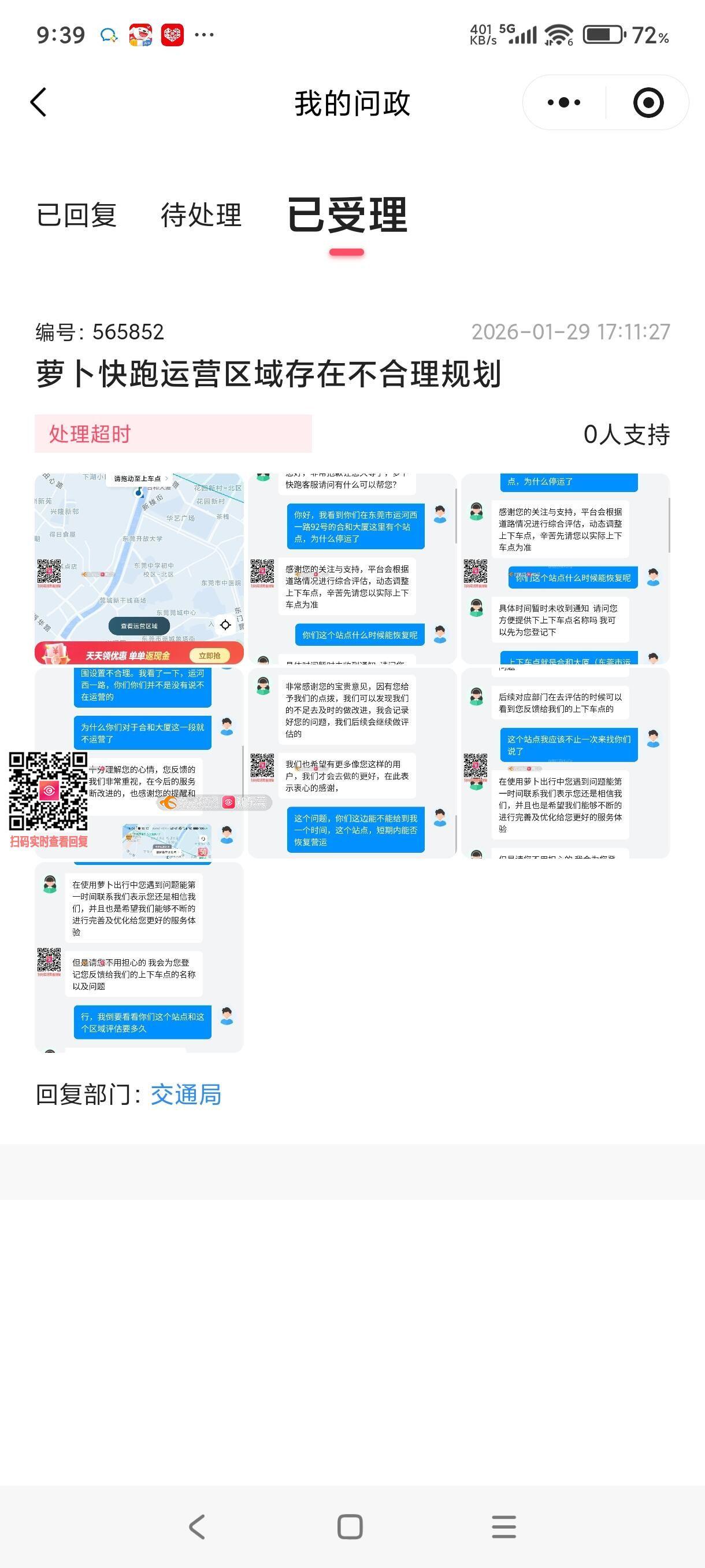 此前在阳光问政平台发起的关于萝卜快跑运营公司的投诉(编号565852),政府部门是否有在处理?此单已超时,希望尽快处理并告知具体完成的时间,谢谢