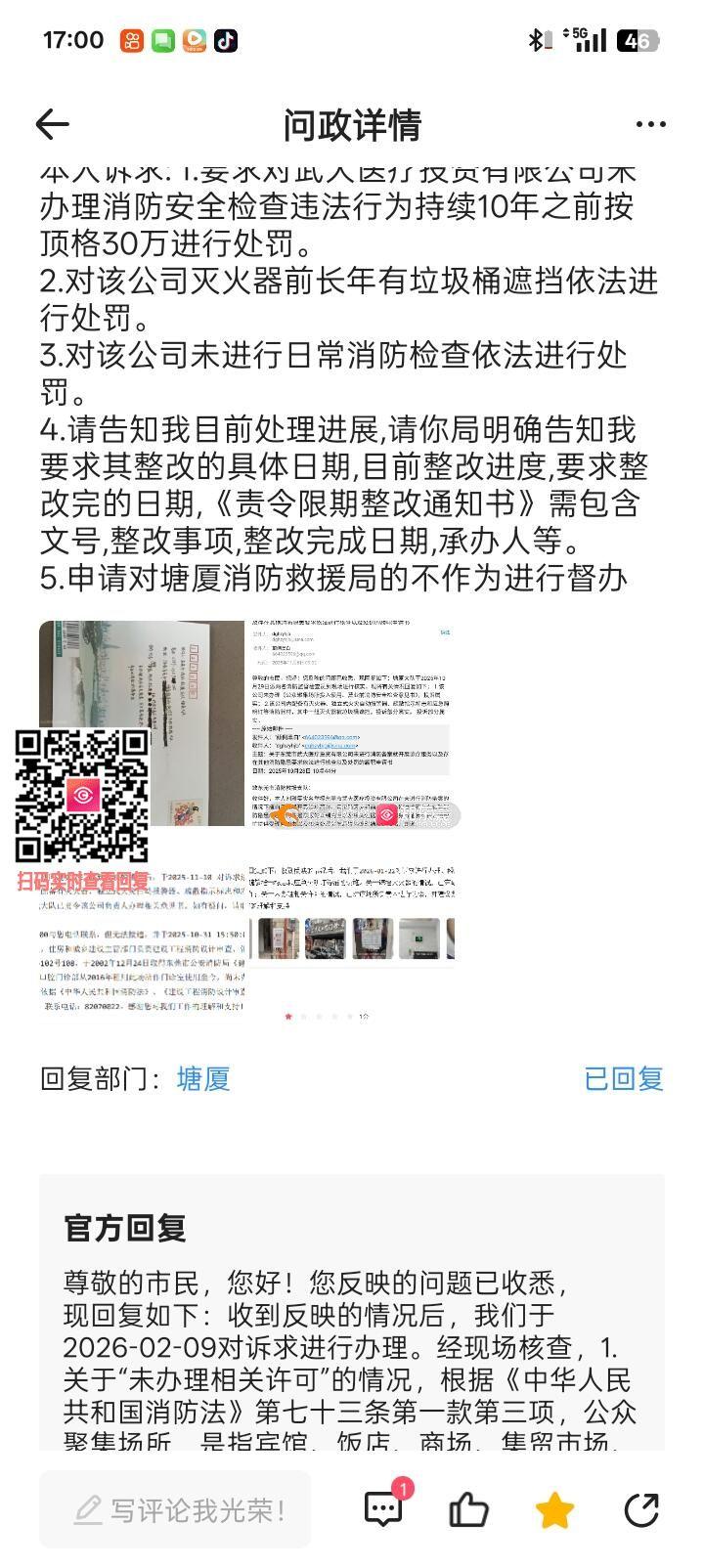 1.所有答复请提供书面的加盖公章的附有救济渠道的答复书给我,请你们依法办事,依法回复。 2.塘厦消防局我都不想吐槽你,我给你寄了多少份履职?最早一封是2025年10月,你现在回复受理不能抹除你曾经不依法履职,存在渎职的事实,我会依法追究。 3.我的诉求写的很明确,关于你们要求武大医疗投资有限公司进行整改,请你们明确答复我要求整改的日期,整改事项,需完整整改的日期以及《责令整改通知书》,这个诉求我也提了很多遍了,多次被你们无视,你们在害怕什么?怕自己未依法履职暴露的更多吗?真正的勇士请直面我的问题,谢谢。