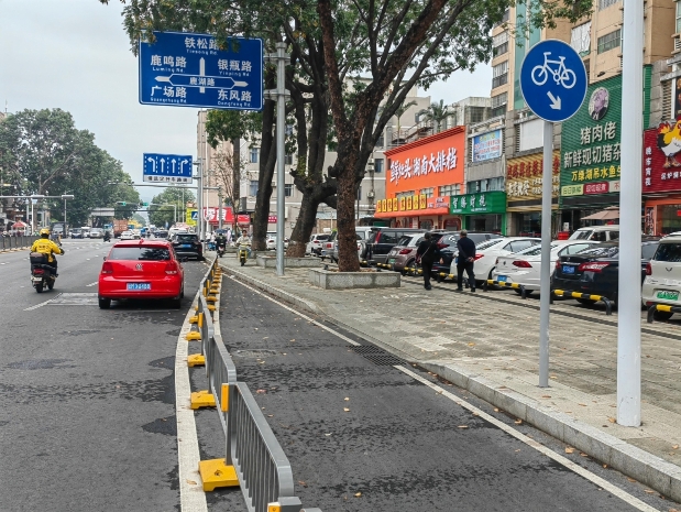 各位领导 你们好: 清溪镇鹿湖西路鹿湖东路与科技路交叉口红绿灯往下处,摆放较多栅栏给非机动车行驶,而且还安装了特别多的监控来拍摄电动车的违规行驶,要求佩戴头盔和走非机动车道,但是你看下图 非机动车道到头就没有了,你让非机动车怎么走,硬生生要非机动车走非机动车道,那也正常来说合理,但是突然就没有了,你让车怎么走,不走这里又被拍,而且有那么多违规摆放的车挡住。