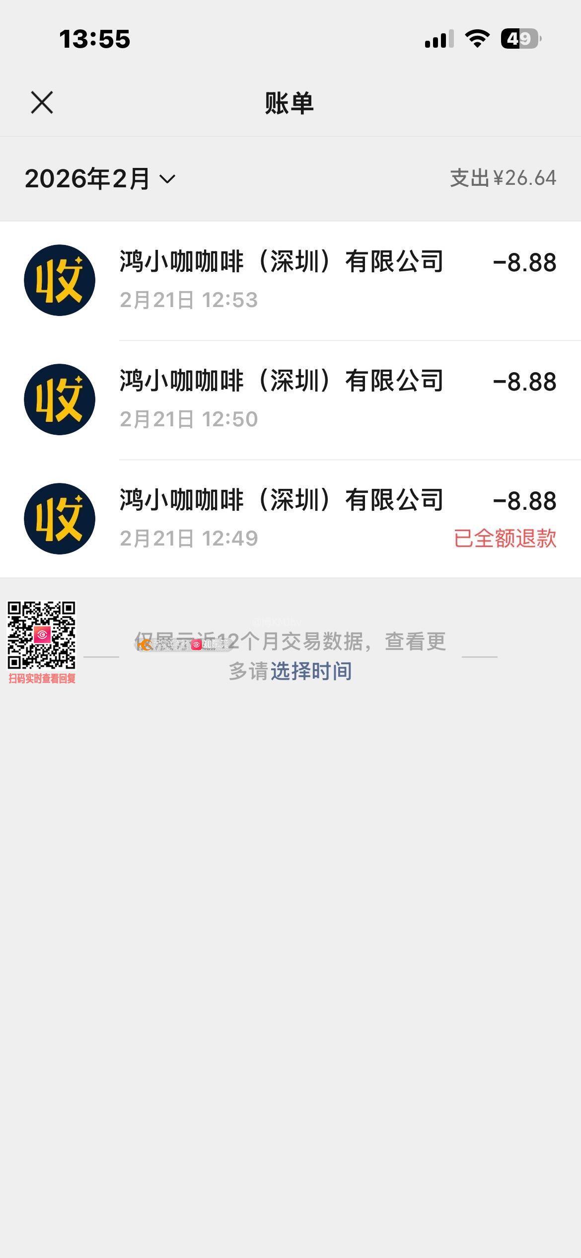 植物园咖啡机扫码不出货不退钱! 一共扫了三笔,两笔申请退款,只退款一笔8.8元,还有一笔未见踪影。植物园如此经营消费欺骗游客?