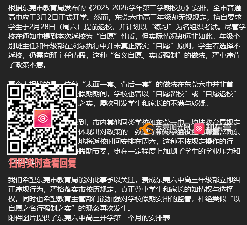 根据东莞市教育局发布的《2025-2026学年第二学期校历》安排,全市普通高中应于3月2日正式开学。然而,东莞六中高三年级却无视规定,擅自要求学生于2月28日(周六)提前返校,并计划以“练习”为名组织考试。尽管学校在通知中提到本次返校为“自愿”性质,但实际情况却远非如此。年级个别班主任和年级部在实际执行中并未真正落实“自愿”原则,学生若选择不返校,仍需向班主任请假,这种“名义自愿、实质强制”的做法,严重违背了政策本意。 更令人担忧的是,这种“表面一套、背后一套”的做法在东莞六中并非首次。此前在周末及元旦假期期间,学校也曾以“自愿留校”或“自愿返校”为名,行“变相强制”之实,屡次引发学生和家长的不满与质疑。 与此同时,我们也注意到,市内其他同类学校如东莞一中,均按教育局规定安排学生于周日返校,体现出对政策的一致遵守和对学生权益的尊重。而东莞六中却“独树一帜”地将返校时间安排在周六,这种不按规定操作的行为,不仅打乱了学生的假期节奏,更在一定程度上加剧了学生的学业压力和心理负担。 我们希望东莞市教育局能对此事予以关注,责成东莞六中高三年级部立即纠正违规行为,严格落实市校历规定,真正尊重学生和家长的知情权与选择权。同时也希望教育主管部门能加强对学校假期安排的监管,杜绝类似“以自愿之名行强制之实”的现象再次发生。 附件图片提供了东莞六中高三开学第一个月的安排表